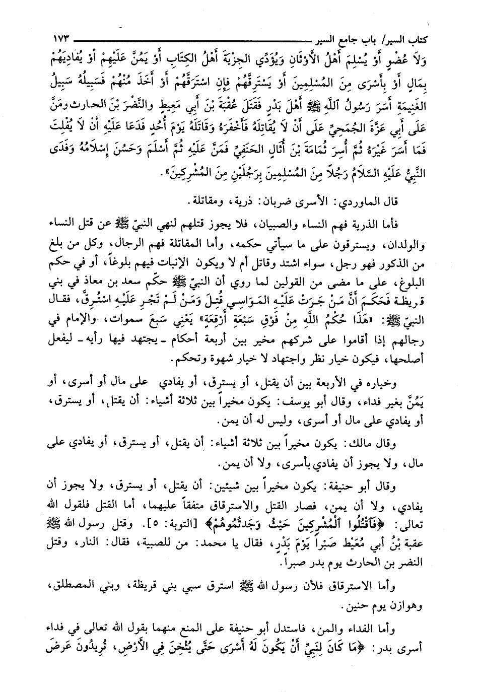 ولا عضو أو يسلم أهل الأوثان ويؤدي الجزية أهل الكتاب أو يمن عليهم أو يفاديهم بمال أو بأسرى من المسلمين أو يسترقهم فإن استرقهم أو أخذ منهم فسبيله سبيل الغنيمة أسر رسول الله - صَلَّى اللَّهُ عَلَيْهِ وَسَلَّم َ - أهل بدر فقتل عقبة بن أبي معيط والنضر بن الحارث ومن على أبي عزة الجحمي على أن لا يقاتله فأخفره وقاتله يوم أحد فدعا عليه أن لا يفلت فما أسر غيره ثم أسر ثمامة بن أثال الحنفي فمن عليه ثم أسلم وحسن إسلامه وفدى النبي عليه السلام رجلا من المسلمين برجلين من المشركين ".