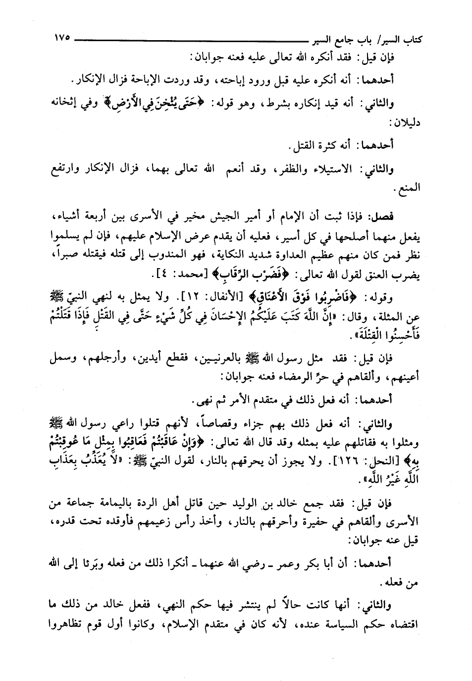 فَإِنْ قِيلَ: فَقَدْ جَمَعَ خَالِدُ بْنُ الْوَلِيدِ حِينَ قَاتَلَ أَهْلَ الرِّدَّةِ بِالْيَمَامَةِ جَمَاعَةً مِنَ الْأَسْرَى وَأَلْقَاهُمْ فِي حُفَيْرَةٍ وَأَحْرَقَهُمْ بِالنَّارِ، وَأَخَذَ رَأْسَ زَعِيمِهِمْ فَأَوْقَدَهُ تَحْتَ قِدْرِهِ، قِيلَ عَنْهُ جَوَابَانِ: