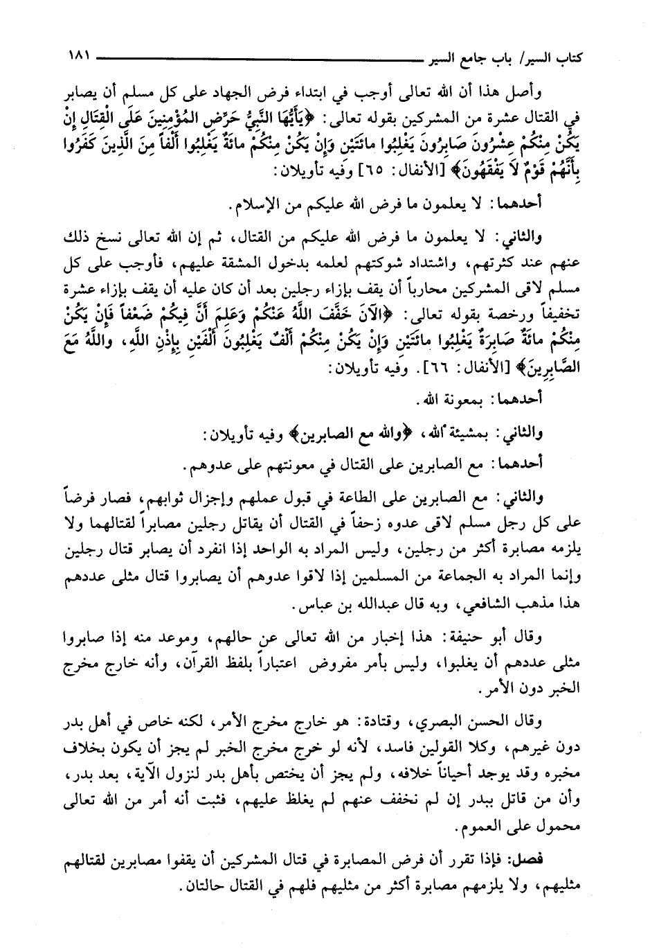 : فَإِذَا تَقَرَّرَ أَنَّ فَرْضَ الْمُصَابَرَةِ فِي قِتَالِ الْمُشْرِكِينَ أَنْ يَقِفُوا مُصَابِرِينَ لِقِتَالِهِمْ مِثْلَيْهِمْ، وَلَا يَلْزَمَهُمْ مُصَابَرَةُ أَكْثَرَ مِنْ مِثْلَيْهِمْ فَلَهُمْ فِي القتال حالتان.