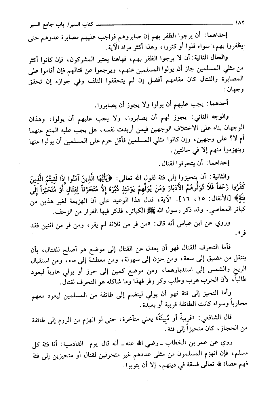 رُوِيَ عَنْ عُمَرَ بْنِ الْخَطَّابِ - رَضِيَ اللَّهُ عَنْهُ - أَنَّهُ قَالَ يَوْمَ الْقَادِسِيَّةِ: أَنَا فِئَةُ كُلِّ مُسْلِمٍ، فَإِنِ انْهَزَمَ الْمُسْلِمُونَ مِنْ مِثْلَيْ عَدَدِهِمْ غَيْرَ مُتَحَرِّفِينَ لِقِتَالٍ أَوْ مُتَحَيِّزِينَ إِلَى فِئَةٍ فَهُمْ عُصَاةٌ لِلَّهِ تَعَالَى فَسَقَةٌ فِي دِينِهِمْ، إِلَّا أَنْ يَتُوبُوا.