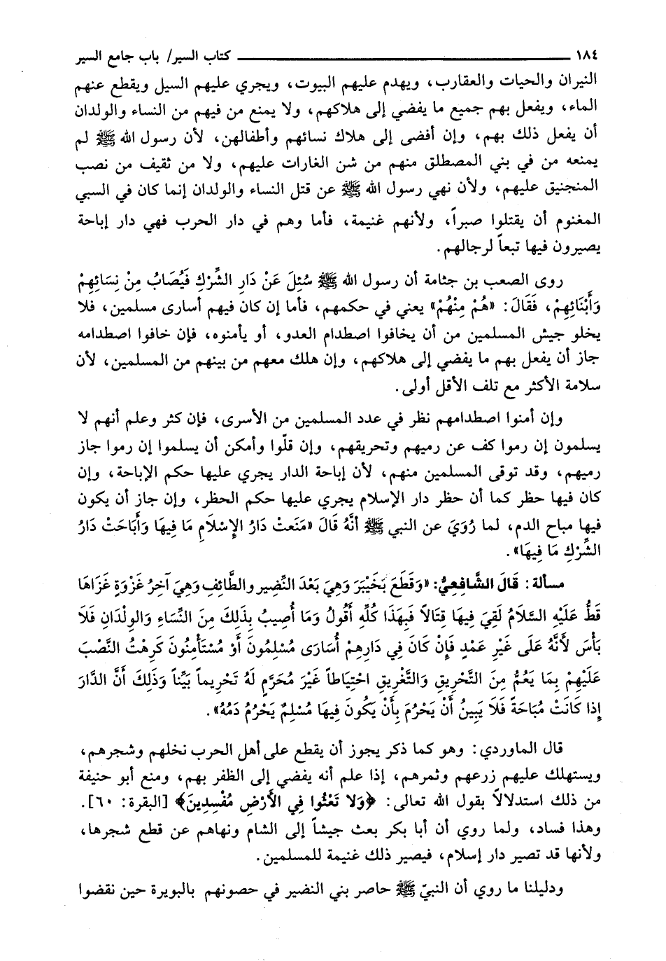 قال الشافعي: " وَقَطَعَ بِخَيْبَرَ وَهِيَ بَعْدَ النَّضِيرِ وَالطَّائِفِ وَهِيَ آخر غزوة غزاها قط عليه السلام لقي فيها قتالا فبهذا كله أقول وما أصيب بذلك من النساء والولدان فلا بأس لأنه على غير عمد فإن كان في دارهم أساري مسلمون أو مستأمنون كرهت النصب عليهم بما يعم من التحريق والتغريق احتياطا غير محرم له تحريما بينا وذلك أن الدار إذا كانت مباحة فلا يبين أن يحرم بأن يكون فيها مسلم يحرم دمه ".