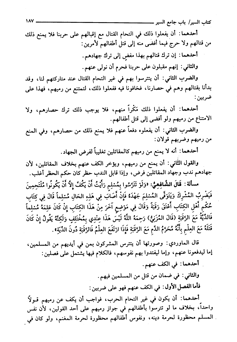 أَحَدُهُمَا: أَنْ يَفْعَلُوا ذَلِكَ فِي الْتِحَامِ الْقِتَالِ مَعَ إِقْبَالِهِمْ عَلَى حَرْبِنَا فَلَا يَمْنَعُ ذَلِكَ مِنْ قِتَالِهِمْ وَلَا حَرَجَ فِيمَا أَفْضَى مِنْهُ إِلَى قَتْلِ أَطْفَالِهِمْ لِأَمْرَيْنِ: