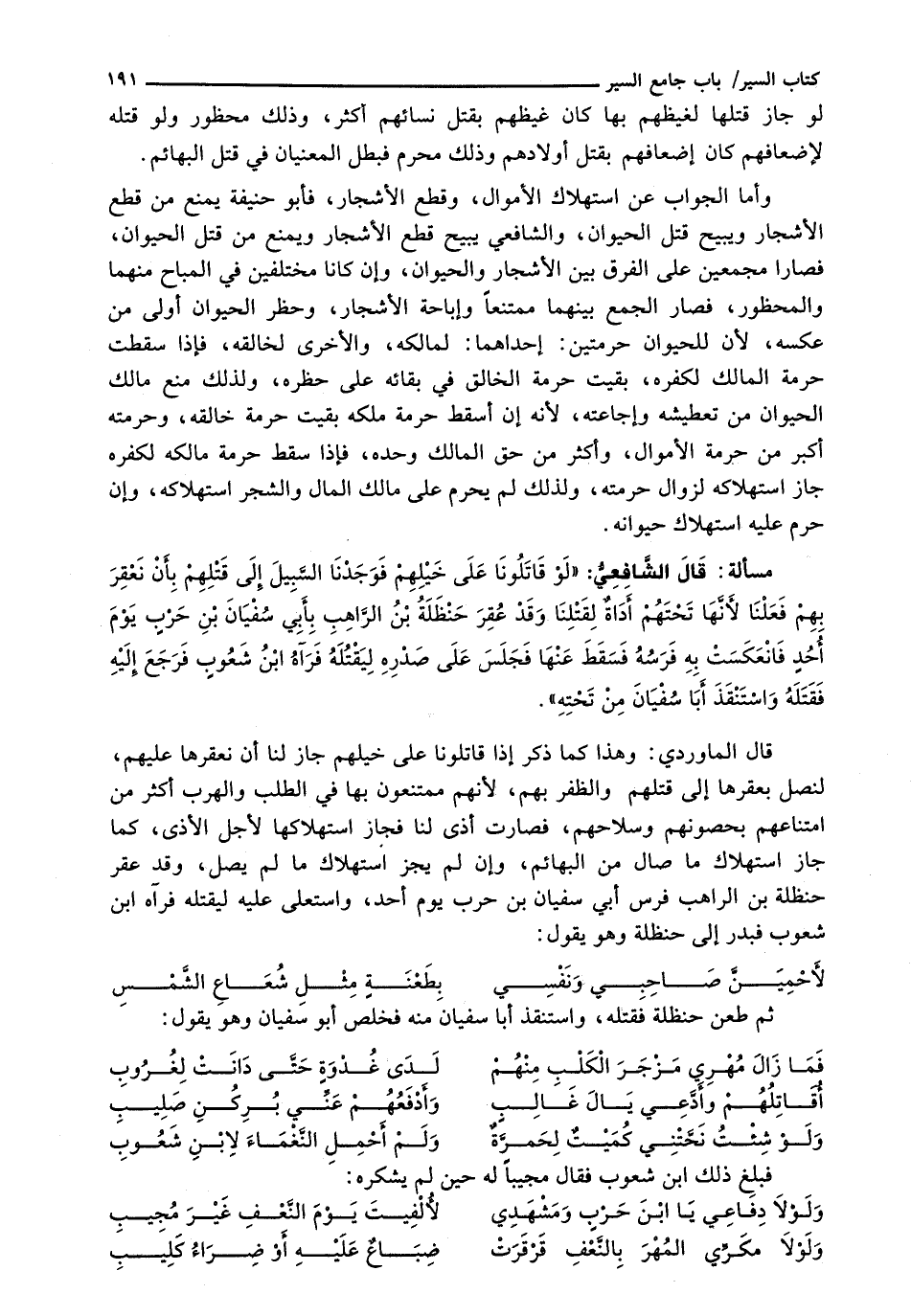 : قال الشافعي: " لَوْ قَاتَلُونَا عَلَى خَيْلِهِمْ فَوَجَدْنَا السَّبِيلَ إِلَى قَتْلِهِمْ بِأَنْ نَعْقِرَ بِهِمْ فَعَلْنَا لِأَنَّهَا تَحْتَهُمْ أَدَاةٌ لِقَتْلِنَا وَقَدْ عَقَرَ حَنْظَلَةُ بْنُ الرَّاهِبِ بأبي سفيان بن حرب يوم أحد فانعكست بِهِ فَرَسُهُ فَسَقَطَ عَنْهَا فَجَلَسَ عَلَى صَدْرِهِ لِيَقْتُلَهُ فَرَآهُ ابْنُ شَعُوبٍ فَرَجَعَ إِلَيْهِ فَقَتَلَهُ وَاسْتَنْقَذَ أَبَا سُفْيَانَ مِنْ تَحْتِهِ ".