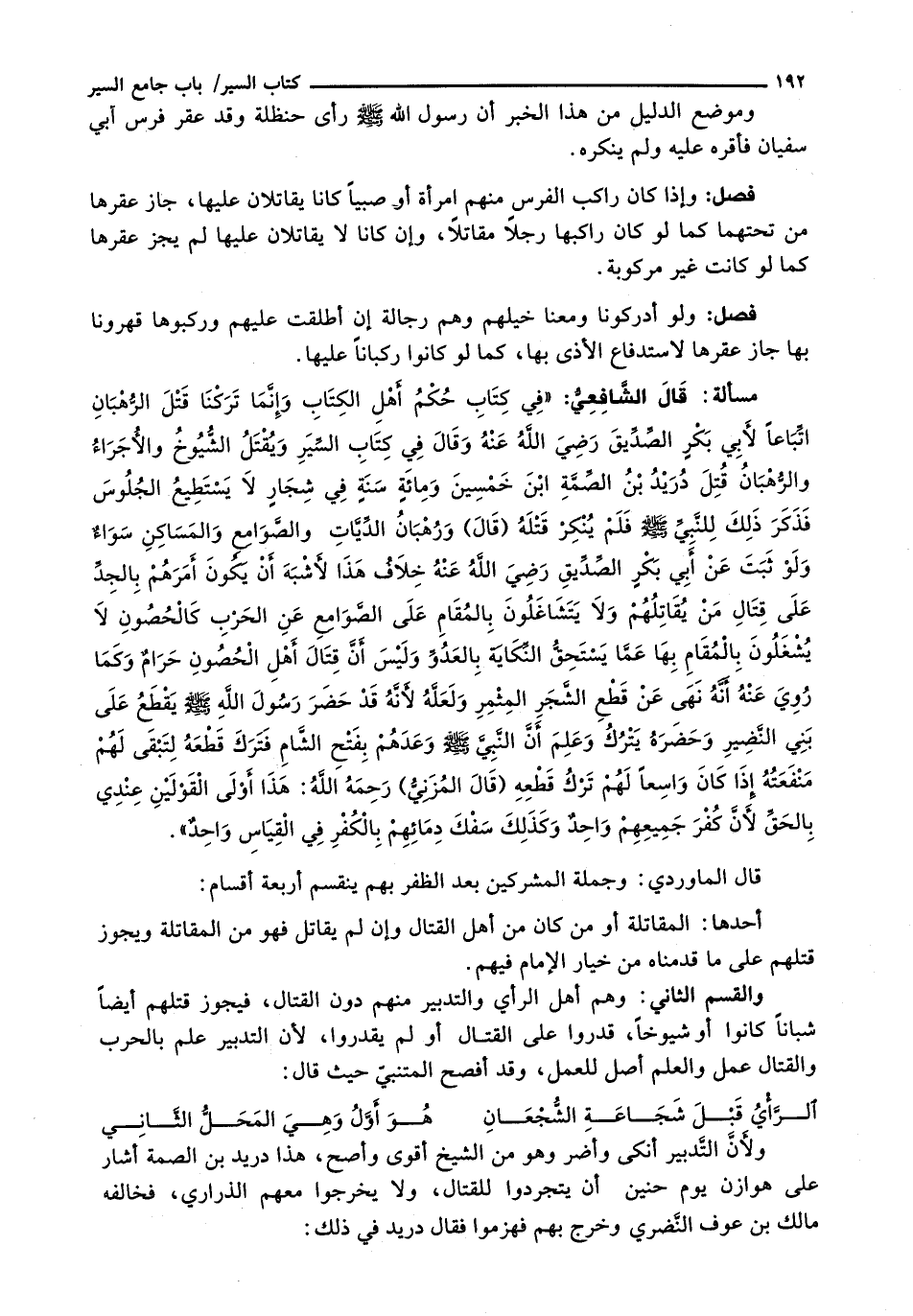 : قال الشافعي: " فِي كِتَابِ حُكْمِ أَهْلِ الْكِتَابِ وَإِنَّمَا تَرَكْنَا قتل الرهبان اتباعا لأبي بكر الصديق رضي الله عنه وَقَالَ فِي كِتَابِ السِّيَرِ وَيُقْتَلُ الشُّيُوخُ وَالْأُجَرَاءُ والرهبان قتل دريد بن الصمة ابن خمسين ومائة سنة في شجار لا يستطيع الجلوس فذكر ذلك للنبي - صَلَّى اللَّهُ عَلَيْهِ وَسَلَّم َ - فلم ينكر قتله (قال) ورهبان الديات والصوامع والمساكن سواء ولو ثبت عَنْ أَبِي بَكْرٍ الصِّدِّيقِ رَضِيَ اللَّهُ عَنْهُ خلاف هذا لأشبه أن يكون أمرهم بالجد على قتال من يقاتلهم ولا يتشاغلون بالمقام على الصوامع عن الحرب كالحصون لا يشغلون بالمقام بها عما يستحق النكاية بالعدو وليس أن قتال أهل الحصون حرام وكما روي عنه أنه نهى عن قطع الشجر المثمر ولعله لأنه قد حظر رسول الله - صَلَّى اللَّهُ عَلَيْهِ وَسَلَّم َ - يقطع على بني النضير وحضره يترك وعلم أن النبي - صَلَّى اللَّهُ عَلَيْهِ وَسَلَّم َ - وعدهم بفتح الشام فترك قطعه لتبقى لهم منفعته إذا كان واسعا لهم ترك قطعه (قال المزني) رحمه الله: هذا أولى القولين عندي بالحق لأن كفر جميعهم واحد وكذلك سفك دمائهم بالكفر في القياس واحد ".