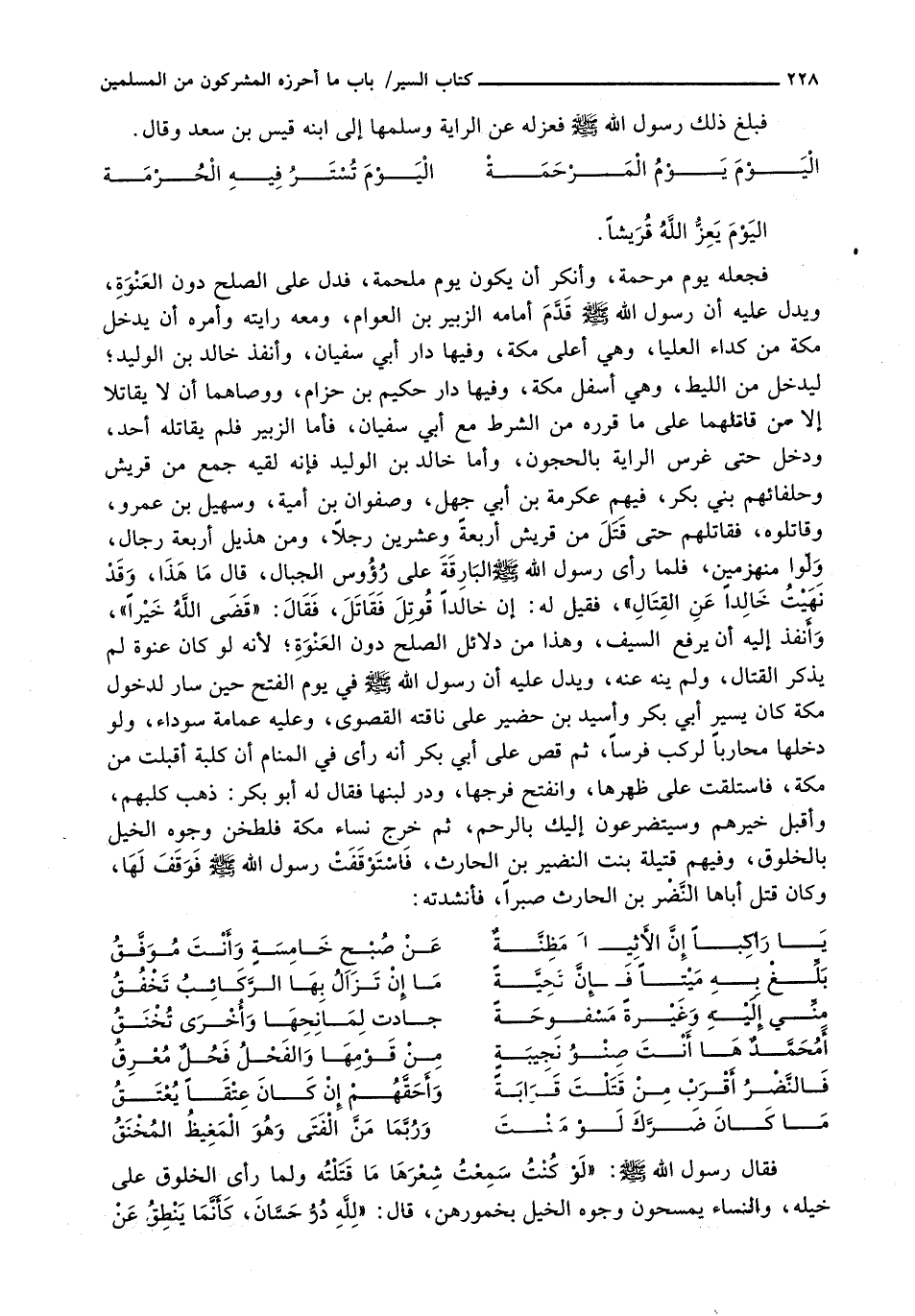 فَجَعلَهُ يَوْمَ مَرْحَمَةٍ، وَأَنْكَرَ أَنْ يَكُونَ يَوْمَ مَلْحَمَةٍ، فَدَلَّ عَلَى الصُّلْحِ دُونَ الْعَنْوَةِ، وَيَدُلُّ عَلَيْهِ أَنَّ رَسُولَ اللَّهِ - صَلَّى اللَّهُ عَلَيْهِ وَسَلَّم َ - قَدَّمَ أَمَامَهُ الزُّبَيْرَ بْنَ الْعَوَّامِ، وَمَعَهُ رَايَتُهُ وَأَمَرَهُ أَنْ يَدْخُلَ مَكَّةَ مِنْ كَدَاءٍ الْعُلْيَا، وَهِيَ أَعْلَى مَكَّةَ، وَفِيهَا دَارُ أَبِي سُفْيَانَ، وَأَنْفَذَ خَالِدَ بْنَ الْوَلِيدِ؛ لِيَدْخُلَ مِنَ اللَّيْطِ، وَهِيَ أَسْفَلَ مَكَّةَ، وَفِيهَا دَارُ حَكِيمِ بْنِ حِزَامٍ وَوَصَّاهُمَا أَنْ لَا يُقَاتِلَا إِلَّا مَنْ قَاتَلَهُمَا عَلَى مَا قَرَّرَهُ مِنَ الشَّرْطِ مَعَ أَبِي سُفْيَانَ، فَأَمَّا الزُّبَيْرُ فَلَمْ يُقَاتِلْهُ أَحَدٌ، وَدَخَلَ حَتَّى غَرَسَ الرَّايَةَ بِالْحَجُونِ، وَأَمَّا خَالِدُ بْنُ الْوَلِيدِ فَإِنَّهُ لَقِيَهُ جَمْعٌ مِنْ قُرَيْشٍ وَحُلَفَائِهِمْ بَنِي بَكْرٍ، فِيهِمْ عِكْرِمَةُ بْنُ أَبِي جهل، وصفوان بن أمية، وسهيل بن عمرو وَقَاتَلُوهُ، فَقَاتَلَهُمْ حَتَّى قَتَلَ مِنْ قُرَيْشٍ أَرْبَعَةً وَعِشْرِينَ رَجُلًا، وَمِنْ هُذَيْلَ أَرْبَعَةَ رِجَالٍ، وَلُّوا مُنْهَزِمِينَ، فَلَمَّا رَأَى رَسُولَ اللَّهِ - صَلَّى اللَّهُ عَلَيْهِ وَسَلَّم َ - البارقة على رؤوس الْجِبَالِ، قَالَ مَا هَذَا، وَقَدْ نَهَيْتُ خَالِدًا عَنِ الْقِتَالِ " فَقِيلَ لَهُ: إِنَّ خَالِدًا قُوتِلَ فَقَاتَلَ: فَقَالَ: " قَضَى اللَّهُ خَيْرًا " وَأَنْفَذَ إِلَيْهِ أن يرفع السَّيْفَ، وَهَذَا مِنْ دَلَائِلِ الصُّلْحِ دُونَ الْعَنْوَةِ؛ لِأَنَّهُ لَوْ كَانَ عَنْوَةً لَمْ يَذْكُرِ الْقِتَالَ، وَلَمْ يَنْهَ عَنْهُ، وَيَدُلُّ عَلَيْهِ أَنَّ رَسُولَ اللَّهِ - صَلَّى اللَّهُ عَلَيْهِ وَسَلَّم َ - فِي يَوْمِ الْفَتْحِ حِينَ سَارَ لِدُخُولِ مَكَّةَ كان يسير أَبِي بَكْرٍ وَأُسَيْدِ بْنِ حُضَيْرٍ عَلَى نَاقَتِهِ لقصوى، وَعَلَيْهِ عِمَامَةٌ سَوْدَاءُ، وَلَوْ دَخَلَهَا مُحَارِبًا لَرَكِبَ فَرَسًا، ثُمَّ قَصَّ عَلَى أَبِي بَكْرٍ أَنَّهُ رَأَى فِي الْمَنَامِ أَنَّ كَلْبَةً أَقْبَلَتْ مِنْ مَكَّةَ فَاسْتَلْقَتْ عَلَى ظَهْرِهَا، وَانْفَتَحَ فَرْجُهَا، وَدُرَّ لَبَنُهَا فَقَالَ لَهُ أَبُو بَكْرٍ: ذَهَبَ كَلْبُهُمْ، وأقبل خيرهم وسيتضرعون إليك بالرحم، ثم خرج نِسَاءُ مَكَّةَ فَلَطَّخْنَ وُجُوهَ الْخَيْلِ بِالْخَلُوقِ، وَفِيهِمْ قتيلة بنت النضير بْنِ الْحَارِثِ، فَاسْتَوْقَفَتْ رَسُولَ اللَّهِ - صَلَّى اللَّهُ عَلَيْهِ وَسَلَّم َ - فَوَقَفَ لَهَا، وَكَانَ قَتَلَ أَبَاهَا النَّضْرَ بْنَ الحارث صبرا فأنشدته: