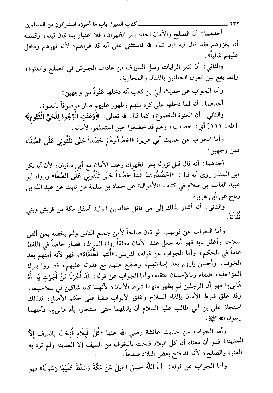 وَأَمَّا الْجَوَابُ عَنْ حَدِيثِ عَائِشَةَ رَضِيَ اللَّهُ عَنْهَا " كُلُّ الْبِلَادِ فُتِحَتْ بِالسَّيْفِ إِلَّا الْمَدِينَةَ " فَهُوَ أَنَّ مَعْنَاهُ أَنَّ كُلَّ الْبِلَادِ فُتِحَتْ بِالْخَوْفِ مِنَ السَّيْفِ إِلَّا الْمَدِينَةَ وَلَمْ تَرِدِ به الْعَنْوَةُ وَالصُّلْحُ؛ لِأَنَّهُ قَدْ فَتَحَ بَعْضَ الْبِلَادِ صُلْحًا.
