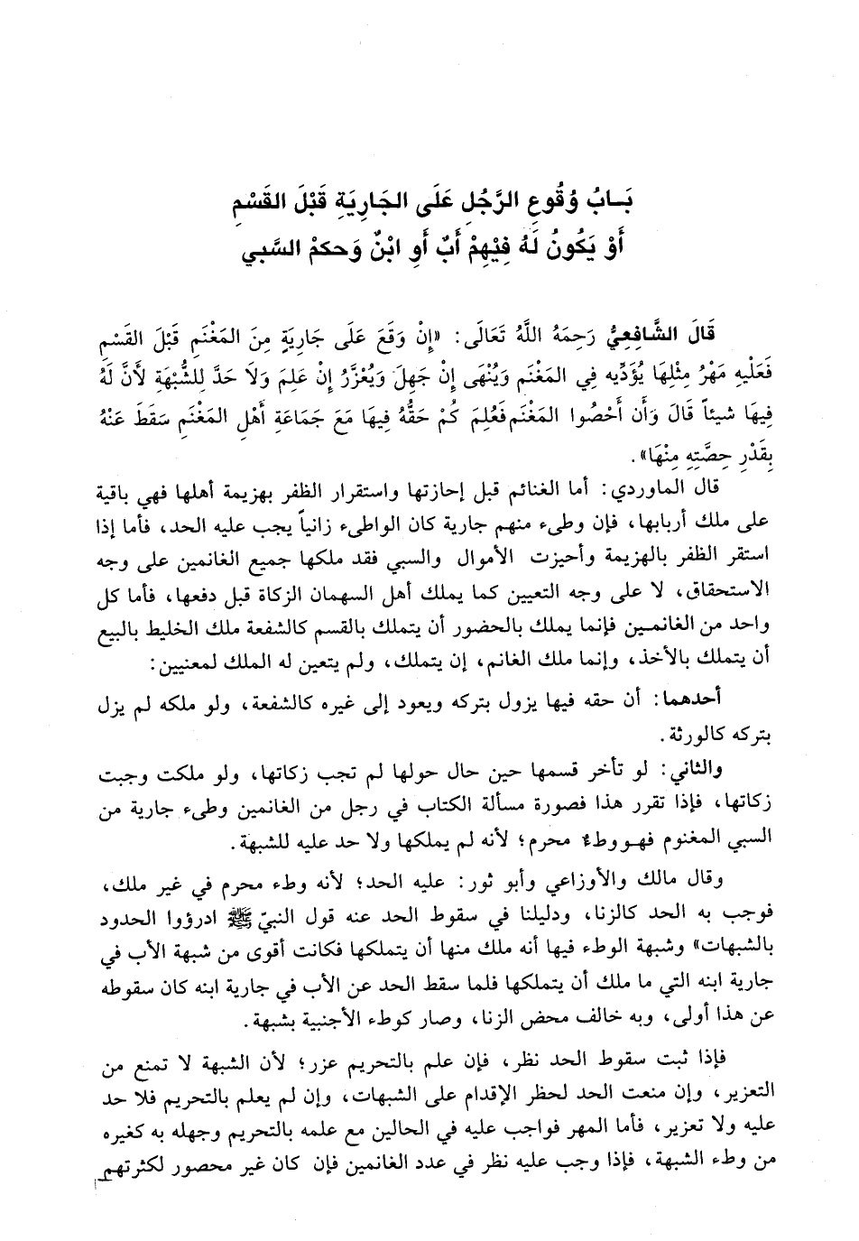 قال الشافعي رحمه الله تعالى: " إن وقع على جَارِيَةٍ مِنَ الْمَغْنَمِ قَبْلَ الْقَسْمِ فَعَلْيهِ مَهْرُ مِثْلِهَا يُؤَدِّيهِ فِي الْمَغْنَمِ وَيُنْهَى إِنْ جَهِلَ وَيُعَزَّرُ إِنْ عَلِمَ وَلَا حَدَّ لِلشُّبْهَةِ لِأَنَّ لَهُ فِيهَا شَيْئًا قَالَ وَإِنْ أَحْصَوُا الْمَغْنَمَ فَعُلِمَ كَمْ حَقُّهُ فِيهَا مَعَ جَمَاعَةِ أَهْلِ الْمَغْنَمِ سَقَطَ عَنْهُ بِقَدْرِ حِصَّتِهِ مِنْهَا ".