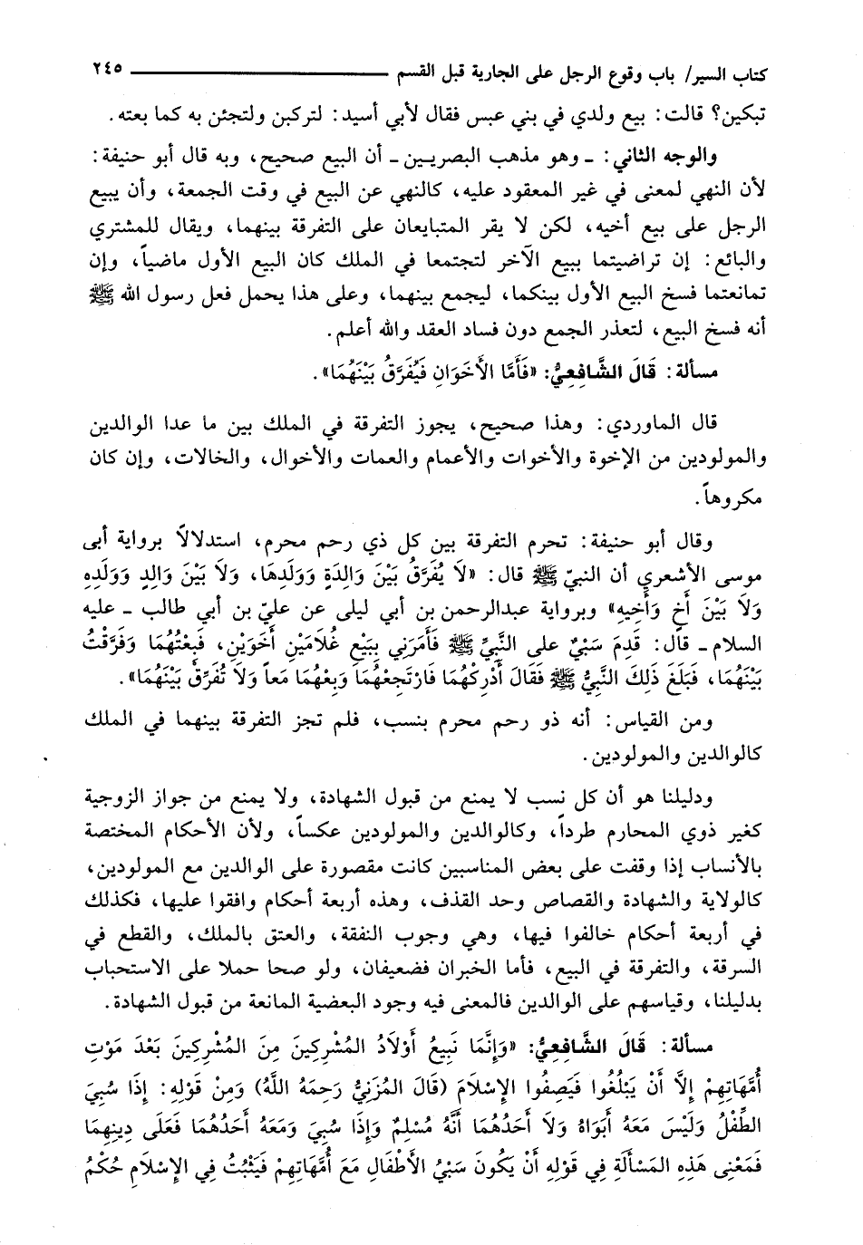 وَقَالَ أَبُو حَنِيفَةَ: تَحْرُمُ التَّفْرِقَةُ بَيْنَ كُلِّ ذِي رَحِمٍ مُحَرَّمٍ، اسْتِدْلَالًا بِرِوَايَةِ أَبَى مُوسَى الْأَشْعَرِيِّ أن النبي - صَلَّى اللَّهُ عَلَيْهِ وَسَلَّم َ - قَالَ: " لَا يُفَرَّقُ بَيْنَ وَالِدَةٍ وَوَلَدِهَا، وَلَا بين والد وولده ولا يبن أَخٍ وَأَخِيهِ " وَبِرِوَايَةِ عَبْدِ الرَّحْمَنِ بْنِ أَبِي لَيْلَى عَنْ عَلِيِّ بْنِ أَبِي طَالِبٍ - عَلَيْهِ السَّلَامُ - قَالَ: قَدِمَ سَبْيٌ عَلَى النَّبِيِّ - صَلَّى اللَّهُ عَلَيْهِ وَسَلَّم َ - فَأَمَرَنِي بِبَيْعِ غُلَامَيْنِ أَخَوَيْنِ، فَبِعْتُهُمَا وَفَرَّقْتُ بَيْنَهُمَا، فَبَلَغَ ذَلِكَ النَّبِيَّ - صَلَّى اللَّهُ عَلَيْهِ وَسَلَّم َ - فَقَالَ أَدْرِكْهُمَا فَارْتَجِعْهُمَا وَبِعْهُمَا مَعًا وَلَا تُفَرِّقْ بَيْنَهُمَا "