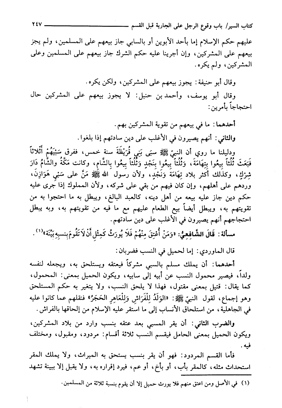 وَالضَّرْبُ الثَّانِي: أَنْ يُقِرَّ الْمُسْبي بَعْدَ عِتْقِهِ بِنَسَبٍ وَارِدٍ مِنْ بِلَادِ الْمُشْرِكِينَ، وَيَكُونَ الْحَمِيلُ بِمَعْنَى الْحَامِلِ فَيُقَسَّمَ النَّسَبُ ثَلَاثَةَ أَقْسَامٍ: مَرْدُودٌ، وَمَقْبُولٌ، وَمُخْتَلَفٌ فِيهِ.