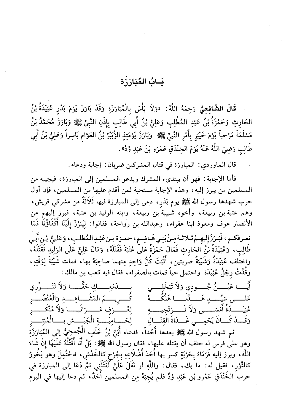 قَالَ الشَّافِعِيُّ رَحِمَهُ اللَّهُ: " وَلَا بَأْسَ بِالْمُبَارَزَةِ وَقَدْ بَارَزَ يَوْمَ بَدْرٍ عُبَيْدَةُ بْنُ الْحَارِثِ وَحَمْزَةُ بْنُ عَبْدِ الْمُطَّلِبِ وَعَلِيُّ بْنُ أَبِي طَالِبٍ بإذن النبي - صَلَّى اللَّهُ عَلَيْهِ وَسَلَّم َ - وَبَارَزَ مُحَمَّدُ بْنُ مَسْلَمَةَ مَرْحَبًا يَوْمَ خَيْبَرَ بأمر النبي - صَلَّى اللَّهُ عَلَيْهِ وَسَلَّم َ - وَبَارَزَ يَوْمَئِذٍ الزُّبَيْرُ بْنُ الْعَوَّامِ يَاسِرًا وَعَلِيُّ بْنُ أَبِي طَالِبٍ رَضِيَ اللَّهُ عَنْهُ يَوْمَ الْخَنْدَقِ عَمْرَو بْنَ عَبْدِ وُدٍّ ".