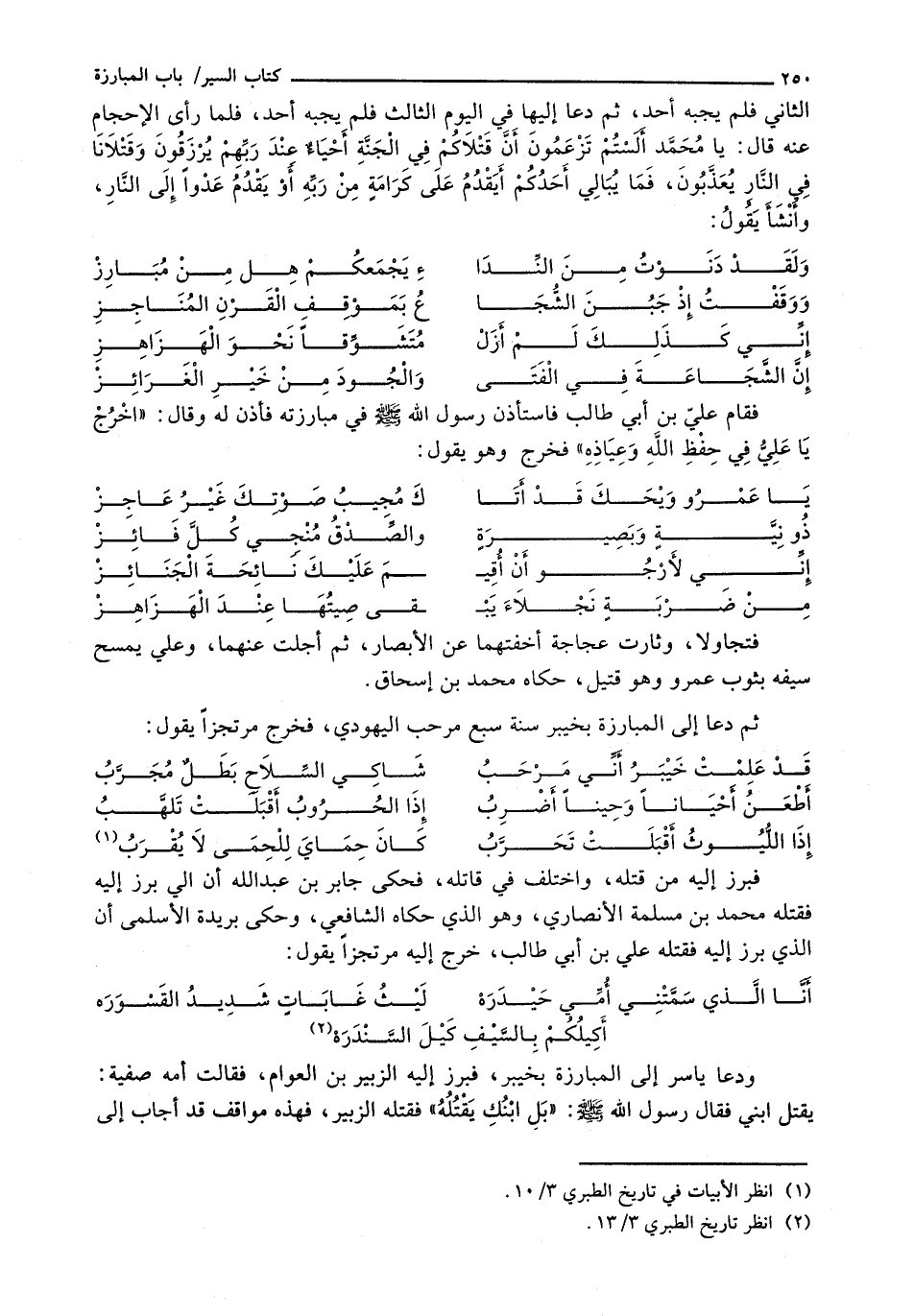 فَقَامَ عَلِيُّ بْنُ أَبِي طَالِبٍ فَاسْتَأْذَنَ رَسُولَ اللَّهِ - صَلَّى اللَّهُ عَلَيْهِ وَسَلَّم َ - فِي مُبَارَزَتِهِ فَأَذِنَ لَهُ وَقَالَ: " اخْرُجْ يَا عَلِيُّ فِي حِفْظِ اللَّهِ وَعِيَاذِهِ " فَخَرَجَ وَهُوَ يقول: