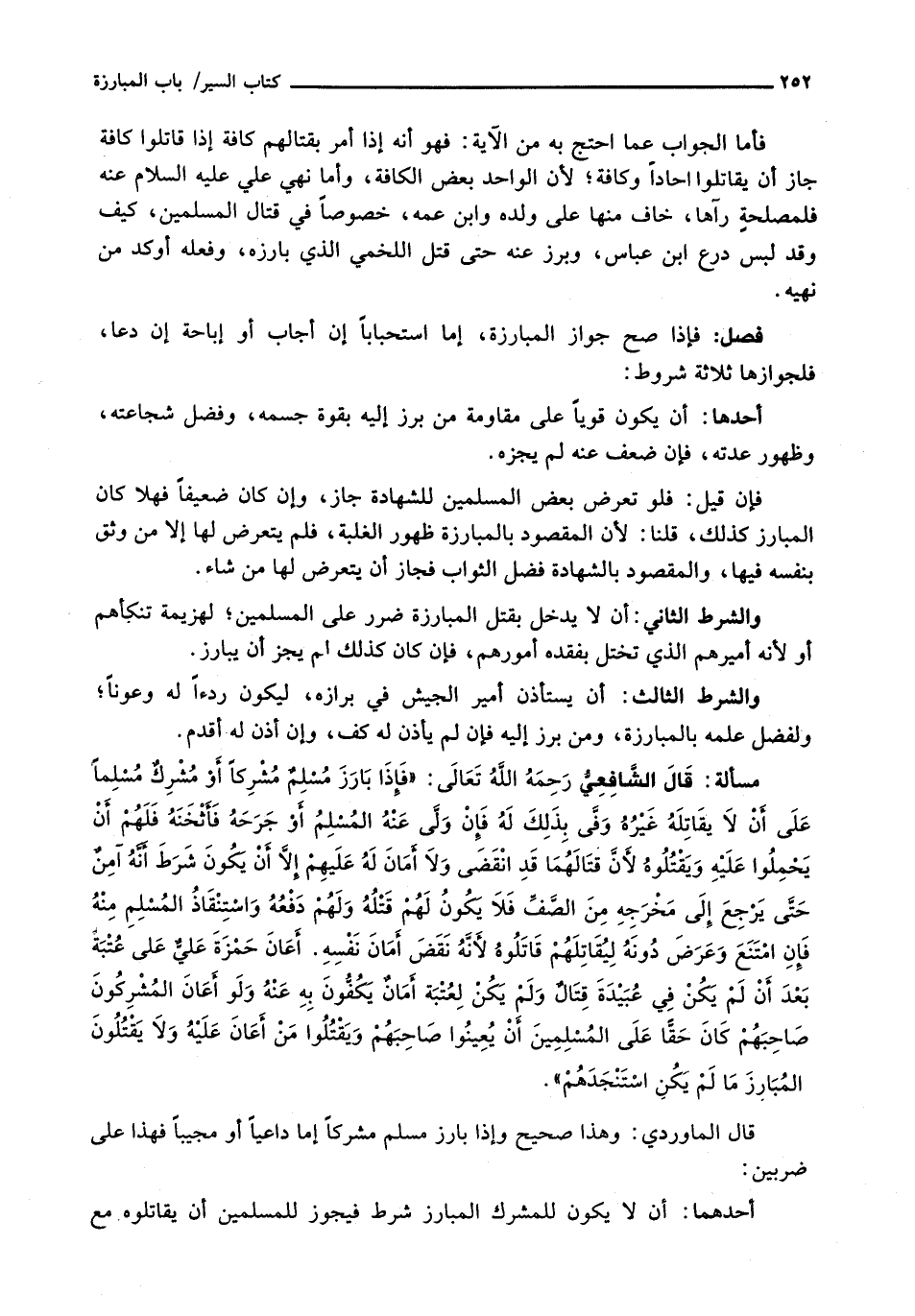 : فَإِذَا صَحَّ جَوَازُ الْمُبَارِزَةِ، إِمَّا اسْتِحْبَابًا إِنْ أَجَابَ أَوْ إِبَاحَةً إِنْ دَعَا فَلِجَوَازِهَا ثَلَاثَةُ شُرُوطٍ: