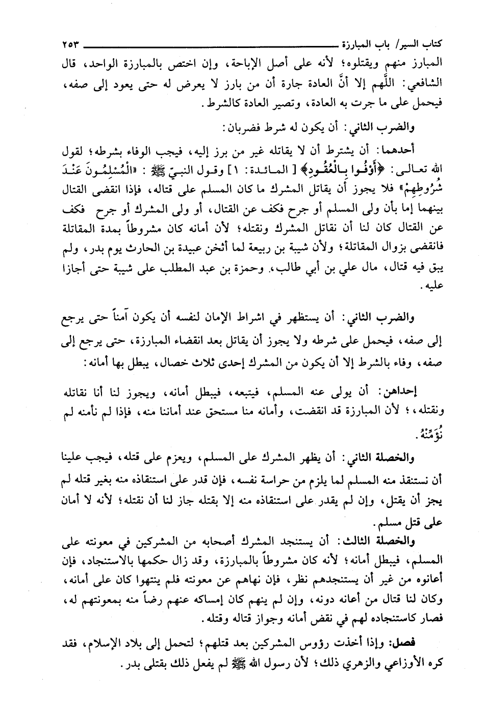 أَحَدُهُمَا: أَنْ يَشْتَرِطَ أَنْ لَا يُقَاتِلَهُ غَيْرُ مَنْ بَرَزَ إِلَيْهِ، فَيَجِبَ الْوَفَاءُ بِشَرْطِهِ؛ لِقَوْلِ اللَّهِ تَعَالَى {أَوْفُوا بِالْعُقُودِ ^) [المائدة: 1] وَقَوْلِ النَّبِيِّ - صَلَّى اللَّهُ عَلَيْهِ وَسَلَّم َ -: " الْمُسْلِمُونَ عِنْدَ شُرُوطِهِمْ " فَلَا يَجُوزُ أَنْ يُقَاتِلَ الْمُشْرِكَ مَا كَانَ الْمُسْلِمُ عَلَى قِتَالِهِ، فَإِذَا انْقَضَى الْقِتَالُ بَيْنَهُمَا إِمَّا بِأَنْ وَلَّى الْمُسْلِمُ أَوْ جُرِحَ فَكَفَّ عَنِ الْقِتَالِ، أَوْ وَلَّى الْمُشْرِكُ أَوْ جُرِحَ فَكَفَّ عَنِ الْقِتَالِ كَانَ لَنَا أَنْ نُقَاتِلَ الْمُشْرِكَ وَنَقْتُلَهُ؛ لِأَنَّ أَمَانَهُ كَانَ مَشْرُوطًا بِمُدَّةِ الْمُقَاتَلَةِ فَانْقَضَى بِزَوَالِ الْمُقَاتَلَةِ؛ وَلِأَنَّ شَيْبَةَ بْنَ رَبِيعَةَ لَمَّا أَثْخَنَ عُبَيْدَةَ بْنَ الْحَارِثِ يَوْمَ بَدْرٍ، وَلَمْ يَبْقَ فِيهِ قِتَالٌ، مَالَ عَلِيُّ بْنُ أَبِي طَالِبٍ، وَحَمْزَةُ بن عبد المطلب على شيبة حتى أجازا عَلَيْهِ.