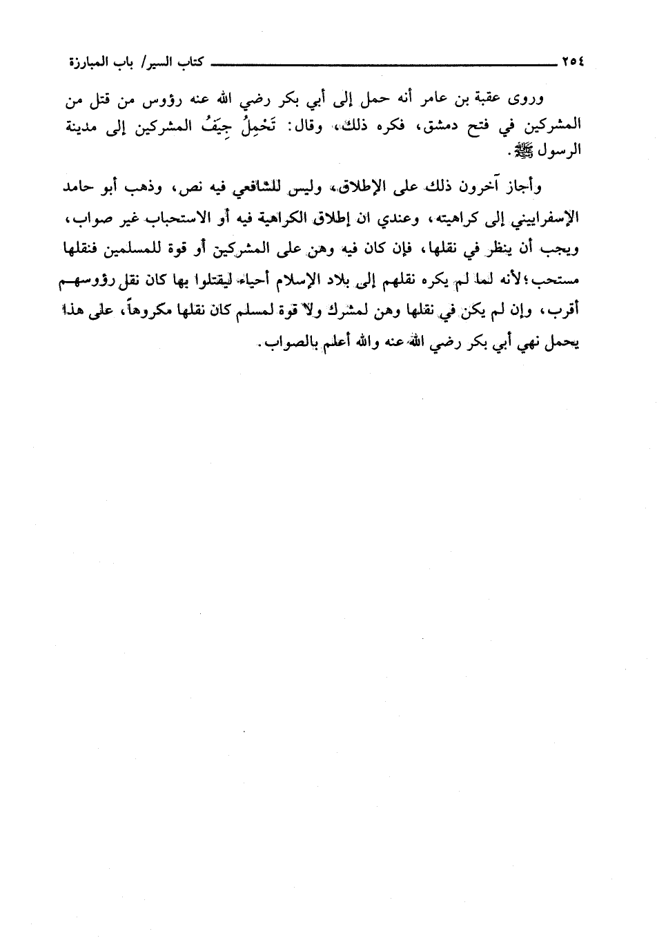 وَأَجَازَ آخَرُونَ ذَلِكَ عَلَى الْإِطْلَاقِ، وَلَيْسَ لِلشَّافِعِيِّ فِيهِ نَصٌّ، وَذَهَبَ أَبُو حَامِدٍ الْإِسْفَرَايِينِي إِلَى كَرَاهِيَتِهِ، وَعِنْدِي أَنَّ إِطْلَاقَ الْكَرَاهِيَةِ فِيهِ أَوِ الِاسْتِحْبَابِ غَيْرُ صَوَابٍ. وَيَجِبُ أَنْ يُنْظَرَ فِي نَقْلِهَا، فَإِنْ كَانَ فِيهِ وَهَنٌ عَلَى الْمُشْرِكِينَ أو قوة للمسلمين فنقلها مستحب؛ لِأَنَّهُ لَمَّا لَمْ يُكْرَهْ نَقْلُهُمْ إِلَى بِلَادِ الإسلام أحياء ليقتلوا بها كان نقل رؤوسهم أَقْرَبَ، وَإِنْ لَمْ يَكُنْ فِي نَقْلِهَا وَهَنٌ لِمُشْرِكٍ وَلَا قُوَّةٌ لِمُسْلِمٍ كَانَ نَقْلُهَا مَكْرُوهًا، على هَذَا يُحْمَلُ نَهْيُ أَبِي بَكْرٍ رَضِيَ اللَّهُ عَنْهُ وَاللَّهُ أَعْلَمُ بِالصَّوَابِ.