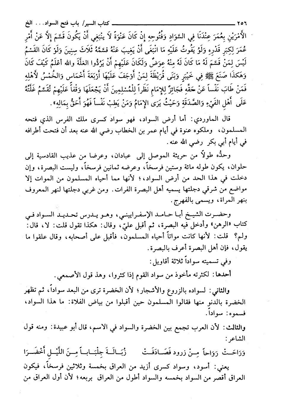قَالَ الْمَاوَرْدِيُّ: أَمَّا أَرْضُ السَّوَادِ، فَهُوَ سَوَادُ كِسْرَى مَلِكِ الْفُرْسِ الَّذِي فَتَحَهُ الْمُسْلِمُونَ، وَمَلَكُوهُ عَنْوَةً فِي أَيَّامِ عُمَرَ بْنِ الْخَطَّابِ رَضِيَ اللَّهُ عَنْهُ بَعْدَ أَنْ فُتِحَتْ أَطْرَافُهُ فِي أَيَّامِ أَبِي بَكْرٍ رَضِيَ اللَّهُ عَنْهُ.