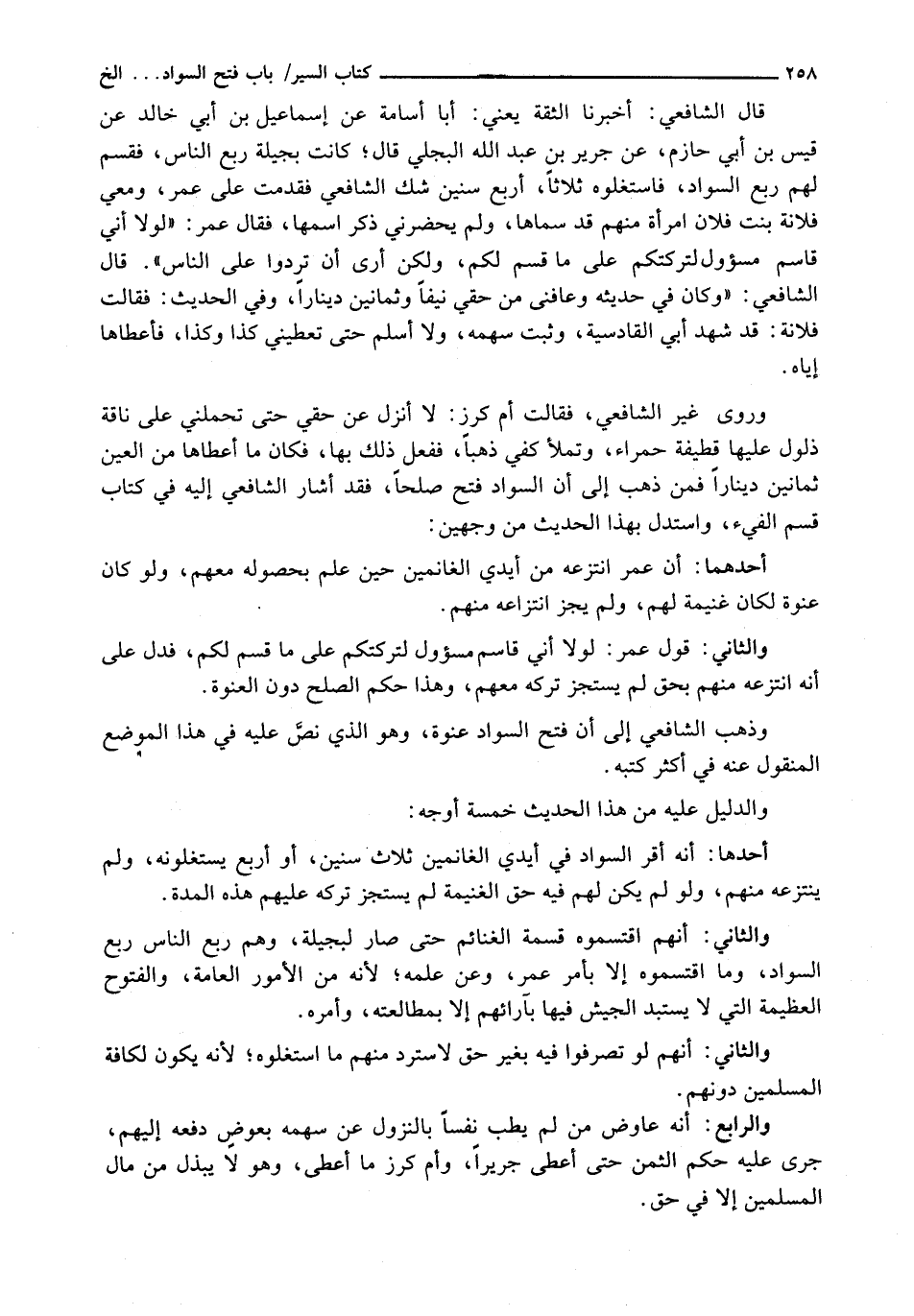 وَذَهَبَ الشَّافِعِيُّ إِلَى أَنَّ فَتْحَ السَّوَادِ عَنْوَةٌ، وَهُوَ الَّذِي نَصَّ عَلَيْهِ فِي هَذَا الْمَوْضِعِ الْمَنْقُولِ عَنْهُ فِي أَكْثَرِ كُتُبِهِ.