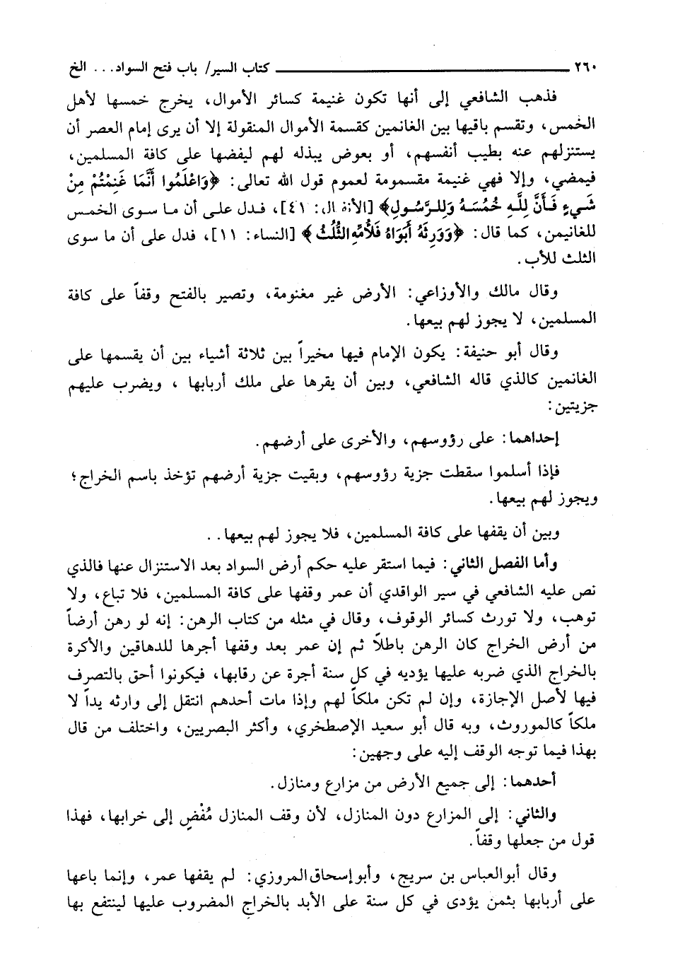 وَأَمَّا الْفَصْلُ الثَّانِي: فِيمَا اسْتَقَرَّ عَلَيْهِ حُكْمُ أَرْضِ السَّوَادِ بَعْدَ الِاسْتِنْزَالِ عَنْهَا فَالَّذِي نَصَّ عَلَيْهِ الشَّافِعِيُّ فِي سِيَرِ الْوَاقِدِيِّ أَنَّ عُمَرَ وَقَفَهَا عَلَى كَافَّةِ الْمُسْلِمِينَ، فَلَا تُبَاعُ، وَلَا تُوهَبُ، وَلَا تُوَرَّثُ كَسَائِرِ الْوُقُوفِ، وَقَالَ فِي مِثْلِهِ مِنْ كِتَابِ الرَّهْنِ: إِنَّهُ لَوْ رَهَنَ أَرْضًا مِنْ أَرْضِ الْخَرَاجِ كَانَ الرَّهْنُ بَاطِلًا ثُمَّ إِنَّ عُمَرَ بَعْدَ وَقْفِهَا أَجَّرَهَا لِلدَّهَاقِينِ وَالْأُكَرَةِ بِالْخَرَاجِ الَّذِي ضَرَبَهُ عَلَيْهَا يُؤَدِّيهِ فِي كُلِّ سَنَةٍ أُجْرَةً عَنْ رِقَابِهَا، فَيَكُونُوا أَحَقَّ بِالتَّصَرُّفِ فِيهَا لِأَصْلِ الْإِجَازَةِ، وَإِنْ لَمْ تَكُنْ مِلْكًا لَهُمْ وَإِذَا مَاتَ أَحَدُهُمُ انْتَقَلَ إِلَى وَارِثِهِ يَدًا لَا مِلْكًا كَالْمَوْرُوثِ، وَبِهِ قَالَ أَبُو سَعِيدٍ الْإِصْطَخْرِيُّ، وَأَكْثَرُ الْبَصْرِيِّينَ، وَاخْتَلَفَ مَنْ قَالَ بِهَذَا فِيمَا تُوُجَّهَ الْوَقْفُ إِلَيْهِ عَلَى وَجْهَيْنِ: