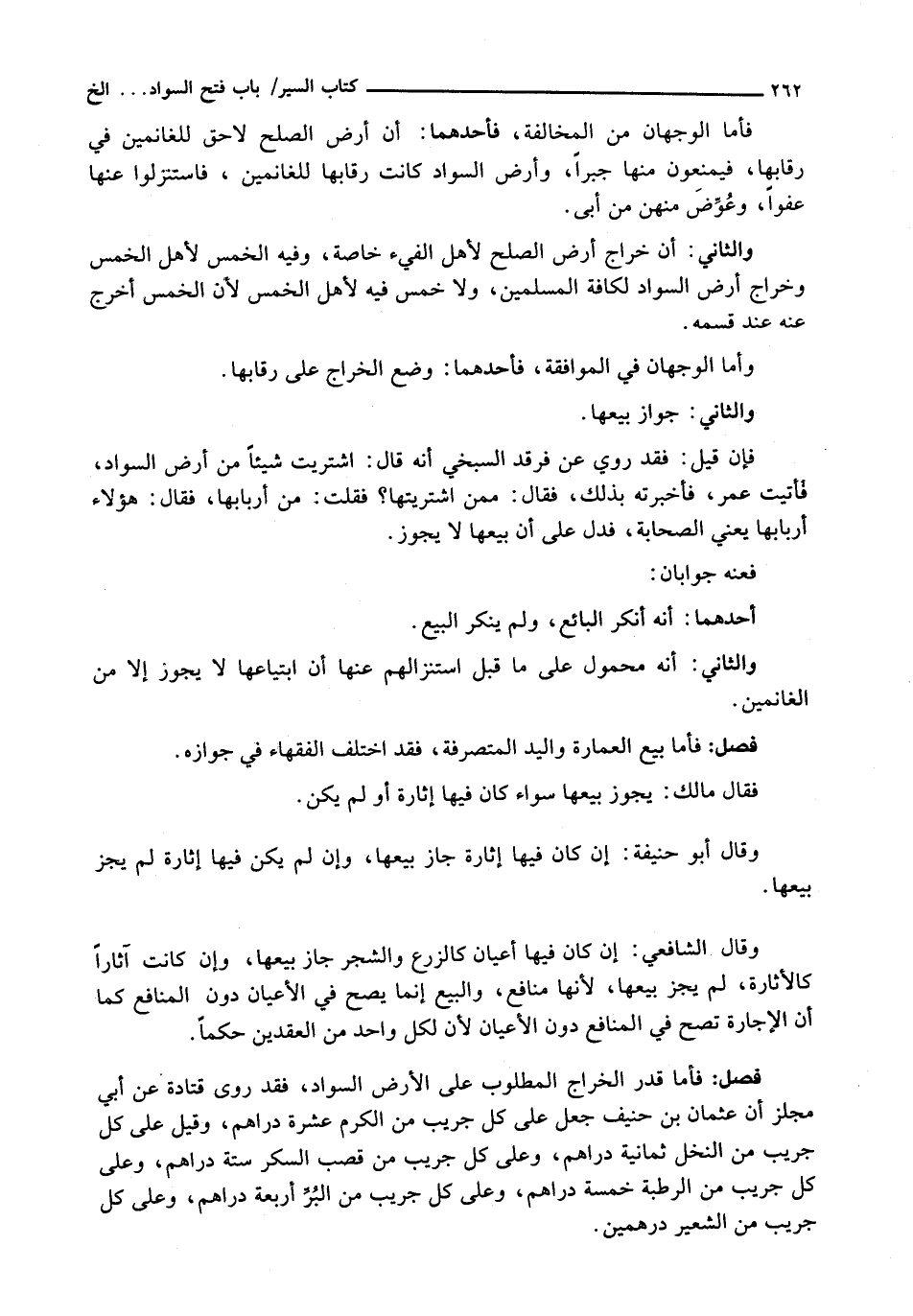 : فَأَمَّا قَدْرُ الْخَرَاجِ الْمَطْلُوبِ عَلَى الْأَرْضِ السَّوَادِ، فَقَدْ رَوَى قَتَادَةُ عَنْ أَبِي مِجْلَزٍ أَنَّ عُثْمَانَ بْنَ حُنَيْفٍ جَعَلَ عَلَى كُلِّ جَرِيبٍ مِنَ الْكَرْمِ عَشْرَةَ دَرَاهِمَ، وَقِيلَ عَلَى كُلِّ جَرِيبٍ مِنَ النَّخْلِ ثَمَانِيَةَ دَرَاهِمَ، وَعَلَى كُلِّ جَرِيبٍ مِنْ قَصَبِ السُّكَّرِ سِتَّةَ دَرَاهِمَ، وَعَلَى كُلِّ جَرِيبٍ مِنَ الرَّطْبَةِ خَمْسَةَ دَرَاهِمَ، وَعَلَى كُلِّ جَرِيبٍ مِنَ الْبُرِّ أَرْبَعَةَ دَرَاهِمَ، وَعَلَى كُلِّ جَرِيبٍ مِنَ الشعير درهمين.