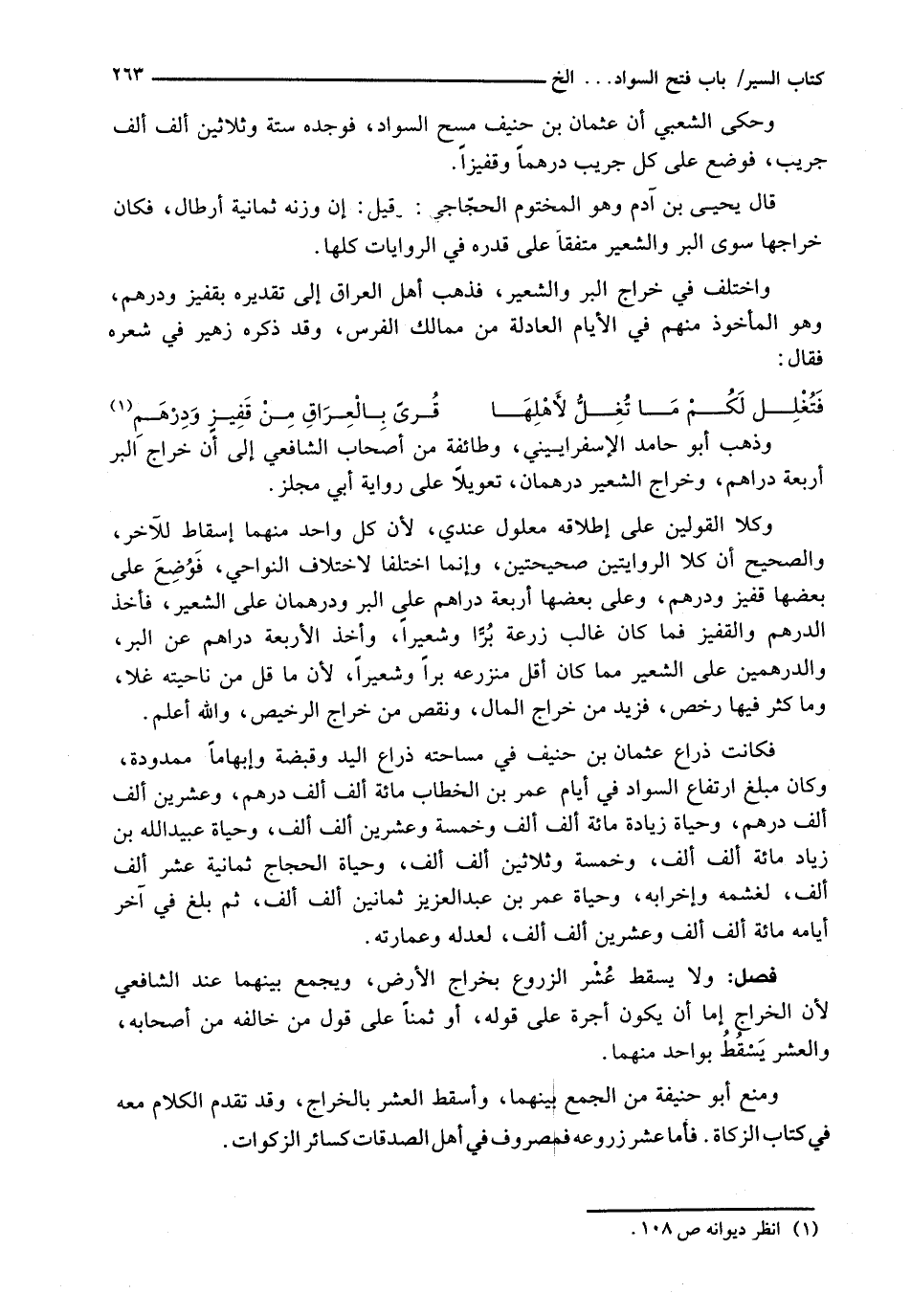 وَاخْتُلِفَ فِي خَرَاجِ الْبُرِّ وَالشَّعِيرِ، فَذَهَبَ أَهْلُ الْعِرَاقِ إِلَى تَقْدِيرِهِ بِقَفِيزٍ وَدِرْهَمٍ، وَهَو الْمَأْخُوذُ مِنْهُمْ فِي الْأَيَّامِ الْعَادِلَةِ مِنْ مَمَالِكِ الْفُرْسِ، وَقَدْ ذَكَرَهُ زُهَيْرٌ فِي شِعْرِهِ فَقَالَ: