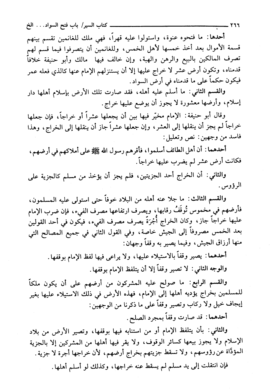 أَحَدُهَا: مَا فَتَحُوهُ عَنْوَةً، وَاسْتَوْلَوْا عَلَيْهِ قَهْرًا، فَهِيَ مِلْكٌ لِلْغَانِمِينَ تُقَسَّمُ بَيْنَهُمْ قِسْمَةَ الْأَمْوَالِ بَعْدَ أَخْذِ خُمْسِهَا لِأَهْلِ الْخُمْسِ، وَلِلْغَانِمِينَ أَنْ يَتَصَرَّفُوا فِيمَا قُسِّمَ لَهُمْ تَصَرُّفَ الْمَالِكِينَ بِالْبَيْعِ وَالرَّهْنِ وَالْهِبَةِ، وَإِنْ خَالَفَ فِيهَا مَالِكٌ وَأَبُو حَنِيفَةَ خِلَافًا قَدَّمْنَاهُ، وَتَكُونُ أَرْضَ عُشْرٍ لَا خَرَاجَ عَلَيْهَا إِلَّا أَنْ يَسْتَنْزِلَهُمُ الْإِمَامُ عَنْهَا كَالَّذِي فَعَلَهُ عُمَرُ فَيَكُونَ حُكْمًا عَلَى مَا قَدَّمْنَاهُ فِي أَرْضِ السَّوَادِ.