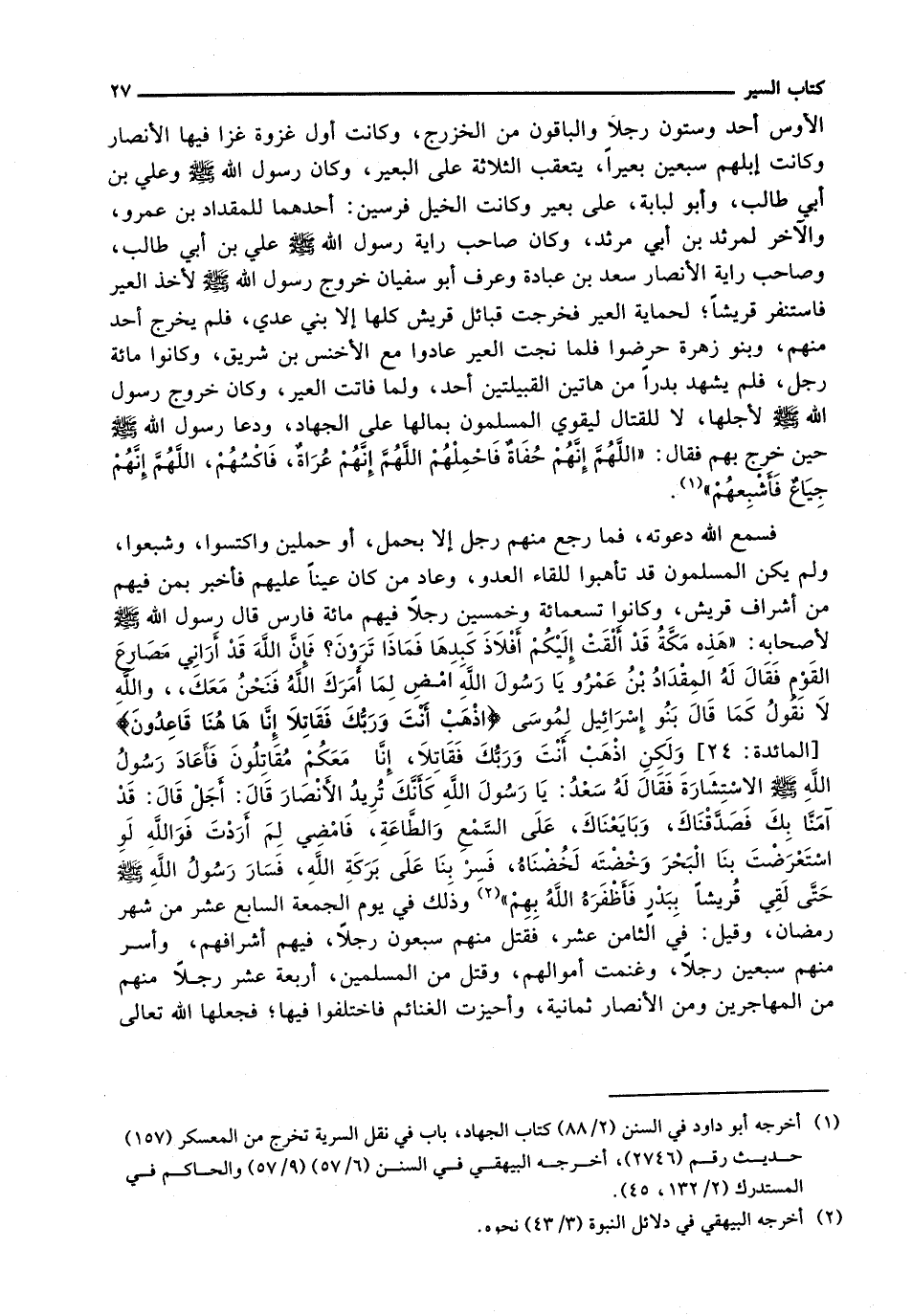 الْأَوْسِ أَحَدٌ وَسِتُّونَ رَجُلًا وَالْبَاقُونَ مَنِ الْخَزْرَجِ، وَكَانَتْ أَوَّلَ غَزْوَةٍ غَزَا فِيهَا الْأَنْصَارُ وَكَانَتْ إِبِلُهُمْ سَبْعِينَ بَعِيرًا، يَتَعَقَّبُ الثَّلَاثَةُ عَلَى الْبَعِيرِ، وَكَانَ رَسُولُ اللَّهِ - صَلَّى اللَّهُ عَلَيْهِ وَسَلَّم َ - وَعَلِيُّ بْنُ أَبِي طَالِبٍ، وَأَبُو لُبَابَةَ، عَلَى بَعِيرٍ وَكَانَتِ الْخَيْلُ فَرَسَيْنِ: أَحَدُهُمَا لِلْمِقْدَادِ بْنِ عَمْرٍو وَالْآخَرُ لِمَرْثَدِ بْنِ أَبِي مَرْثَدٍ، وَكَانَ صَاحِبَ رَايَةِ رَسُولِ اللَّهِ - صَلَّى اللَّهُ عَلَيْهِ وَسَلَّم َ - عَلِيُّ بْنُ أَبِي طَالِبٍ وَصَاحِبَ رَايَةِ الْأَنْصَارِ سَعْدُ بْنُ عُبَادَةَ وَعَرَفَ أَبُو سُفْيَانَ خُرُوجَ رسول الله - صَلَّى اللَّهُ عَلَيْهِ وَسَلَّم َ - لِأَخْذِ الْعِيرِ فَاسْتَنْفَرَ قُرَيْشًا لِحِمَايَةِ الْعِيرِ فَخَرَجَتْ قَبَائِلُ قُرَيْشٍ كُلُّهَا إِلَّا بَنِي عَدِيٍّ، فَلَمْ يَخْرُجْ أَحَدٌ مِنْهُمْ، وَبَنُو زُهْرَةَ حُرِّضُوا فَلَمَّا نَجَتِ الْعِيرُ عَادُوا مَعَ الْأَخْنَسِ بْنِ شَرِيقٍ، وَكَانُوا مِائَةَ رَجُلٍ، فَلَمْ يَشْهَدْ بَدْرًا مِنْ هَاتَيْنِ الْقَبِيلَتَيْنِ أَحَدٌ، وَلَمَّا فَاتَتِ الْعِيرُ، وَكَانَ خروج رسول الله - صَلَّى اللَّهُ عَلَيْهِ وَسَلَّم َ - لِأَجْلِهَا، لَا لِلْقِتَالِ لِيَقْوَى الْمُسْلِمُونَ بِمَالِهَا عَلَى الجهاد، ودعا رسول الله