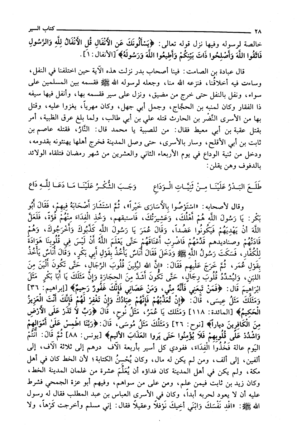 قَالَ عُبَادَةُ بْنُ الصَّامِتِ: فِينَا أَصْحَابَ بَدْرٍ نَزَلَتْ هَذِهِ الْآيَةُ حِينَ اخْتَلَفْنَا فِي النَّفْلِ وَسَاءَتْ فِيهِ أَخْلَاقُنَا، فَنَزَعَهُ اللَّهُ مِنَّا، وَجَعَلَهُ لِرَسُولِ اللَّهِ - صَلَّى اللَّهُ عَلَيْهِ وَسَلَّم َ - فَقَسَمَهُ بَيْنَ الْمُسْلِمِينَ عَلَى سَوَاءٍ، وَنَفَلَ بِالنَّفْلِ حَتَّى خَرَجَ مِنْ مَضِيقٍ، وَنَزَلَ عَلَى سِيرٍ فَقَسَمَهُ بِهَا، وَأُنْفِلَ فِيهَا سَيْفَهُ ذَا الْفَقَارِ وَكَانَ لِمُنَبِّهِ بْنِ الْحَجَّاجِ، وَجَمَلَ أَبِي جَهْلٍ، وَكَانَ مُهْرِيًّا، يَغْزُو عَلَيْهِ، وَقُتِلَ بِهَا مِنَ الْأَسْرَى النَّضْرُ بْنُ الْحَارِثِ قَتَلَهُ عَلِيُّ بْنُ أَبِي طَالِبٍ، وَلَمَّا بَلَغَ عِرْقَ الظَّبْيَةِ، أَمَرَ بِقَتْلِ عُقْبَةَ بْنِ أَبِي مُعَيْطٍ فَقَالَ: مَنْ لِلصِّبْيَةِ يَا مُحَمَّدُ قَالَ: النَّارُ، فَقَتَلَهُ عَاصِمُ بن ثابت بن أبي الافقلح، وَسَارَ بِالْأَسْرَى، حَتَّى وَصَلَ الْمَدِينَةَ فَخَرَجَ أَهْلُهَا يُهَنِّئُونَهُ بِقُدُومِهِ وَدَخَلَ مِنْ ثَنِيَّةِ الْوَدَاعِ فِي يَوْمِ الْأَرْبِعَاءِ الثَّانِي وَالْعِشْرِينَ مِنْ شَهْرِ رَمَضَانَ فَتَلَقَّاهُ الْوَلَائِدُ بِالدُّفُوفِ وَهُنَّ يَقُلْنَ: