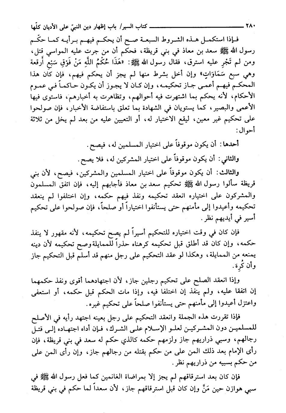 فَإِذَا اسْتَكْمَلَ هَذِهِ الشُّرُوطَ السَّبْعَةَ صَحَّ أَنْ يُحَكِّمَ فِيهِمْ بِرَأْيِهِ كَمَا حُكْمَ رَسُولِ اللَّهِ - صَلَّى اللَّهُ عَلَيْهِ وَسَلَّم َ - سَعْدَ بْنَ مُعَاذٍ فِي بَنِي قُرَيْظَةَ، فَحَكَمَ أن مَنْ جَرَتْ عَلَيْهِ الْمَوَاسِي قُتِلَ، وَمَنْ لَمْ تَجْرِ عَلَيْهِ اسْتُرِقَّ، فَقَالَ رَسُولُ اللَّهِ - صَلَّى اللَّهُ عَلَيْهِ وَسَلَّم َ -: " وهذا حُكْمُ اللَّهِ مَنْ فَوْقِ سَبْعِ أَرْقُعَةٍ " وَهِيَ سَبْعُ سَمَاوَاتٍ " وَإِنْ أَخَلَّ بِشَرْطٍ مِنْهَا لَمْ يجز أن يحكم فيها، فَإِنْ كَانَ هَذَا الْمُحَكَّمُ فِيهِمْ أَعْمَى جَازَ تَحْكِيمُهُ، وَإِنْ كَانَ لَا يَجُوزُ أَنْ يَكُونَ حَاكِمًا فِي عُمُومِ الْأَحْكَامِ، لِأَنَّهُ يَحْكمُ بِمَا اشْتَهَرَتْ فِيهِ أَحْوَالُهُمْ، وَتَظَاهَرَتْ بِهِ أَخْبَارُهُمْ، فَاسْتَوَى فِيهَا الْأَعْمَى وَالْبَصِيرُ، كَمَا يَسْتَوِيَانِ فِي الشَّهَادَةِ بِمَا تُعَلَّقُ بِاسْتِفَاضَةِ الْأَخْبَارِ، فَإِنْ صُولِحُوا عَلَى تَحْكِيمِ غَيْرِ مُعَيَّنٍ، لِيَقَعَ الِاخْتِيَارُ لَهُ، أَوِ التَّعْيِينُ عَلَيْهِ مِنْ بَعْدُ لَمْ يَخْلُ مِنْ ثَلَاثَةِ أَحْوَالٍ: