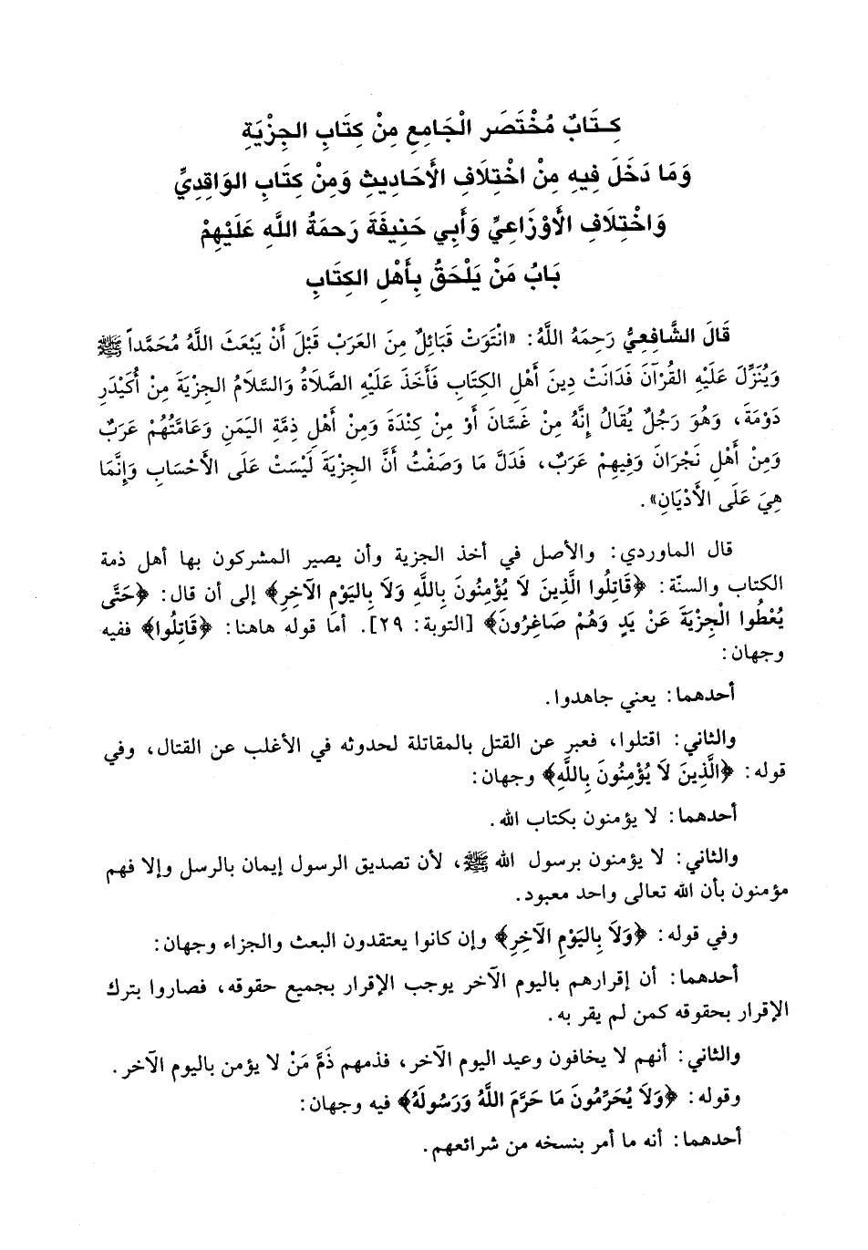 قَالَ الْمَاوَرْدِيُّ: والأصل في أخذ الجزية وأن يَصِيرَ الْمُشْرِكُونَ بِهَا أَهْلَ ذِمَّةِ الْكِتَابِ وَالسُّنَّةِ: {قَاتِلُوا الَّذِينَ لا يُؤْمِنُونَ بِاللَّهِ وَلا بِالْيَوْمِ الآخر} إِلَى أَنْ قَالَ {حَتَّى يُعْطُوا الْجِزْيَةَ عَنْ يَدٍ وَهُمْ صَاغِرُونَ} [التوبة: 29] . أَمَّا قَوْلُهُ هَاهُنَا: {قَاتِلُوا} فَفِيهِ وَجْهَانِ: