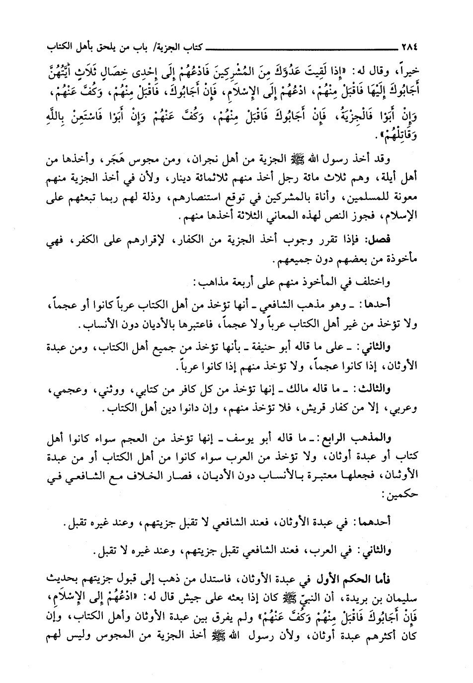 وَقَدْ أَخَذَ رَسُولُ اللَّهِ - صَلَّى اللَّهُ عَلَيْهِ وَسَلَّم َ - الْجِزْيَةَ مِنْ أَهْلِ نَجْرَانَ، وَمِنْ مَجُوسِ هَجَرَ، وأخذها من أهل أيلة، وهم ثلاث مائة رَجُلٍ أَخَذَ مِنْهُمْ ثَلَاثَمِائَةِ دِينَارٍ، وَلِأَنَّ فِي أَخْذِ الْجِزْيَةِ مِنْهُمْ مَعُونَةً لِلْمُسْلِمِينَ، وَأَنَاةً بِالْمُشْرِكِينَ فِي تَوَقُّعِ اسْتِنْصَارِهِمْ، وَذِلَّةً لَهُمْ رُبَّمَا تَبْعَثُهُمْ على الإسلام، فجور النَّصُّ لِهَذِهِ الْمَعَانِي الثَّلَاثَةِ أَخْذَهَا مِنْهُمْ.
