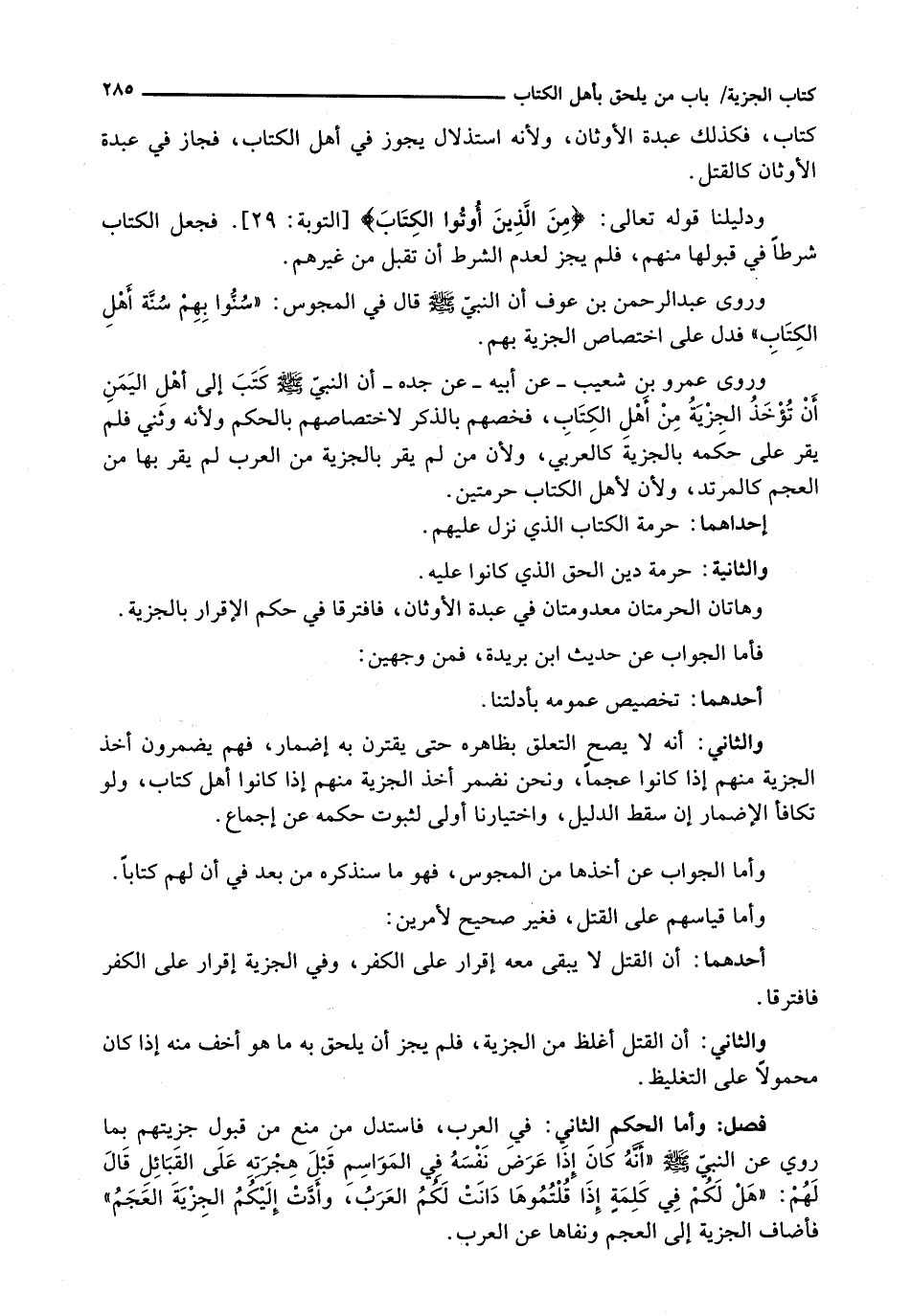 : وَأَمَّا الْحُكْمُ الثَّانِي: فَيَ الْعَرَبِ، فَاسْتَدَلَّ مَنْ مَنَعَ مِنْ قَبُولِ جِزْيَتهمْ بِمَا رُوِيَ عَنِ النَّبِيِّ - صَلَّى اللَّهُ عَلَيْهِ وَسَلَّم َ -: " أَنَّهُ كَانَ إِذَا عَرَضَ نَفْسَهُ فِي الْمَوَاسِمِ قَبْلَ هِجْرَتِهِ عَلَى الْقَبَائِلِ قَالَ لَهُمْ " هَلْ لَكُمْ فِي كَلِمَةٍ إِذَا قُلْتُمُوهَا دَانَتْ لَكُمُ الْعَرَبُ، وَأَدَّتْ إِلَيْكُمُ الْجِزْيَةَ الْعَجَمُ " فَأَضَافَ الْجِزْيَةَ إِلَى الْعَجَمِ وَنَفَاهَا عَنِ الْعَرَبِ.