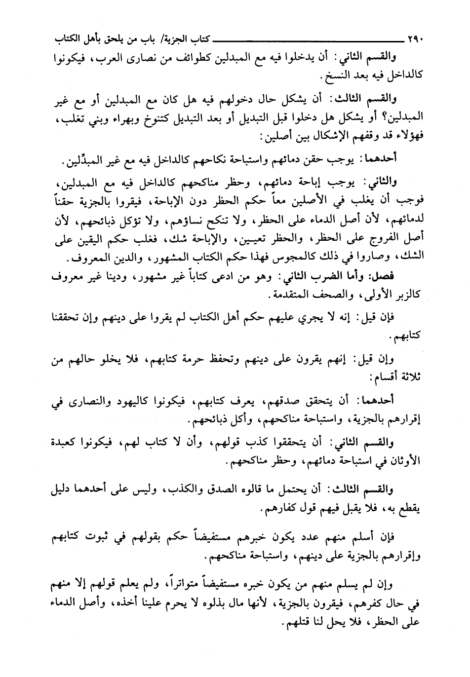 وَالثَّانِي: يُوجِبُ إِبَاحَةَ دِمَائِهِمْ، وَحَظْرَ مَنَاكِحِهِمْ كَالدَّاخِلِ فِيهِ مَعَ الْمُبَدِّلِينَ، فَوَجَبَ أَنْ يَغْلِبَ فِي الْأَصْلَيْنِ مَعًا حُكْمُ الْحَظْرِ دُونَ الْإِبَاحَةِ، فَيُقَرُّوا بِالْجِزْيَةِ حَقْنًا لِدِمَائِهِمْ، لِأَنَّ أَصْلَ الدِّمَاءِ عَلَى الْحَظْرِ، وَلَا تُنْكَحُ نِسَاؤُهُمْ، وَلَا تُؤْكَلُ ذَبَائِحُهُمْ، لِأَنَّ أَصْلَ الْفُرُوجِ عَلَى الْحَظْرِ، وَالْحَظْرُ تَعْيِينٌ، وَالْإِبَاحَةُ شَكٌّ، فَغَلَبَ حُكْمُ الْيَقِينِ عَلَى الشَّكِّ، وَصَارُوا فِي ذَلِكَ كَالْمَجُوسِ فَهَذَا حُكْمُ الْكِتَابِ الْمَشْهُورِ، وَالدِّينِ الْمَعْرُوفِ.