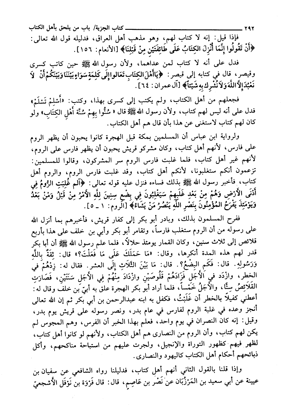 فَدَلَّ عَلَى أَنَّهُ لَا كِتَابَ لِمَنْ عَدَاهُمَا، وَلِأَنَّ رَسُولَ اللَّهِ - صَلَّى اللَّهُ عَلَيْهِ وَسَلَّم َ - حِينَ كَاتَبَ كِسْرَى وَقَيْصَرَ، قَالَ فِي كِتَابِهِ إِلَى قَيْصَرَ {يَا أَهْلَ الْكِتَابِ تَعَالَوْا إِلَى كَلِمَةٍ سَوَاءٍ بيننا وبينكم أن لا نَعْبُدَ إِلا اللَّهَ وَلا نُشْرِكَ بِهِ شَيْئًا} ^ [آل عمران: 64] .