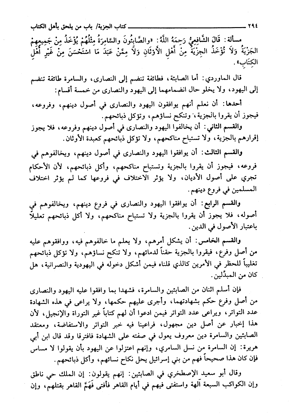 قَالَ الْمَاوَرْدِيُّ: أَمَّا الصَّابِئَةُ، فَطَائِفَةٌ تَنْضَمُّ إِلَى النَّصَارَى، وَالسَّامِرَةُ طَائِفَةٌ تَنْضَمُّ إِلَى الْيَهُودِ، وَلَا يَخْلُو حَالُ انْضِمَامِهَمَا إِلَى الْيَهُودِ وَالنَّصَارَى مِنْ خَمْسَةِ أَقْسَامٍ