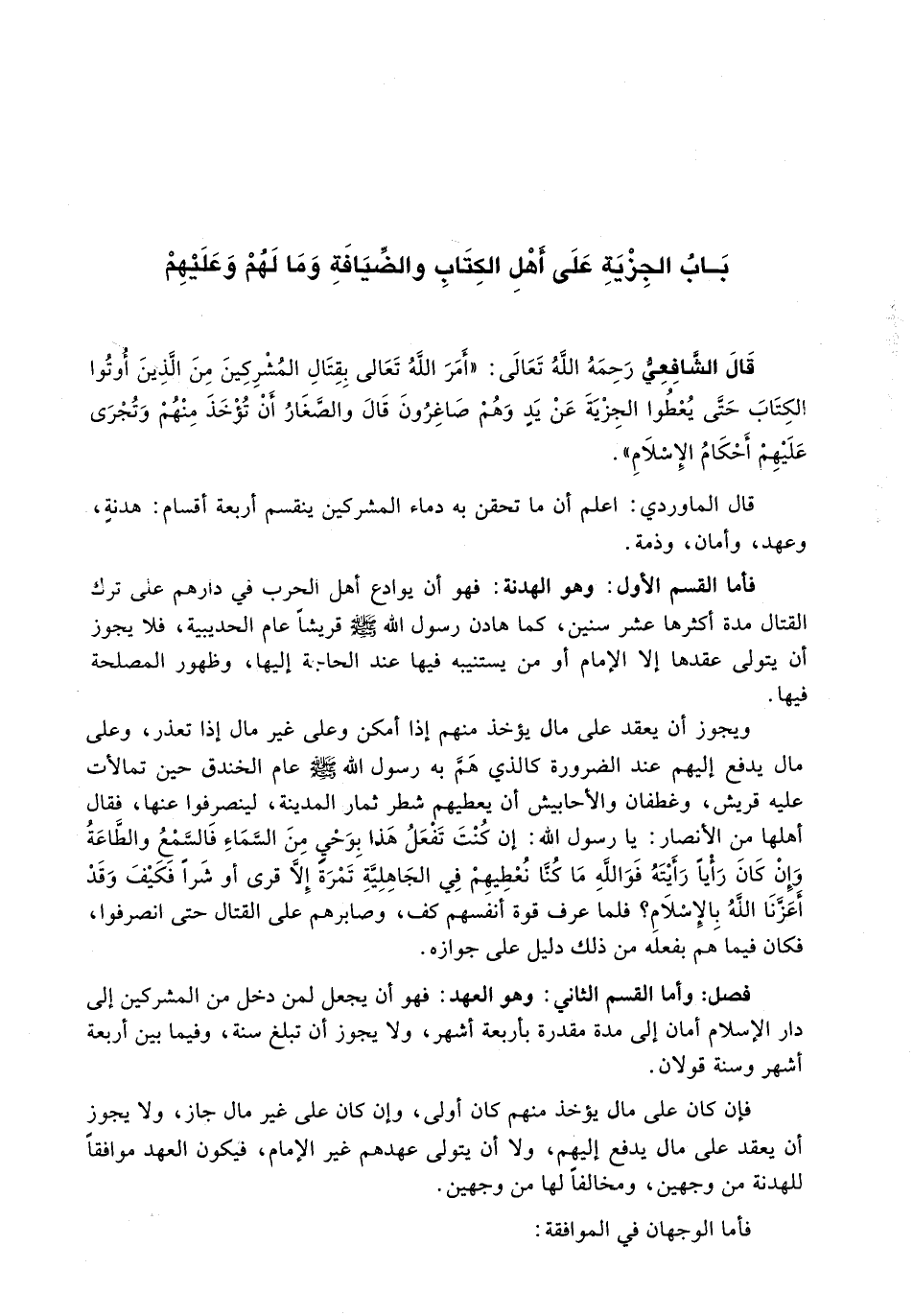 قَالَ الشَّافِعِيُّ رَحِمَهُ اللَّهُ: " أَمَرَ اللَّهُ تَعَالَى بِقِتَالِ الْمُشْرِكِينَ مِنَ الَّذِينَ أُوتُوا الْكِتَابَ حَتَّى يُعْطُوا الْجِزْيَةَ عَنْ يَدٍ وَهُمْ صَاغِرُونَ قَالَ وَالصَّغَارُ أَنْ تُؤْخَذَ مِنْهُمْ وَتُجْرَى عَلَيْهِمْ أَحْكَامُ الْإِسْلَامِ ".