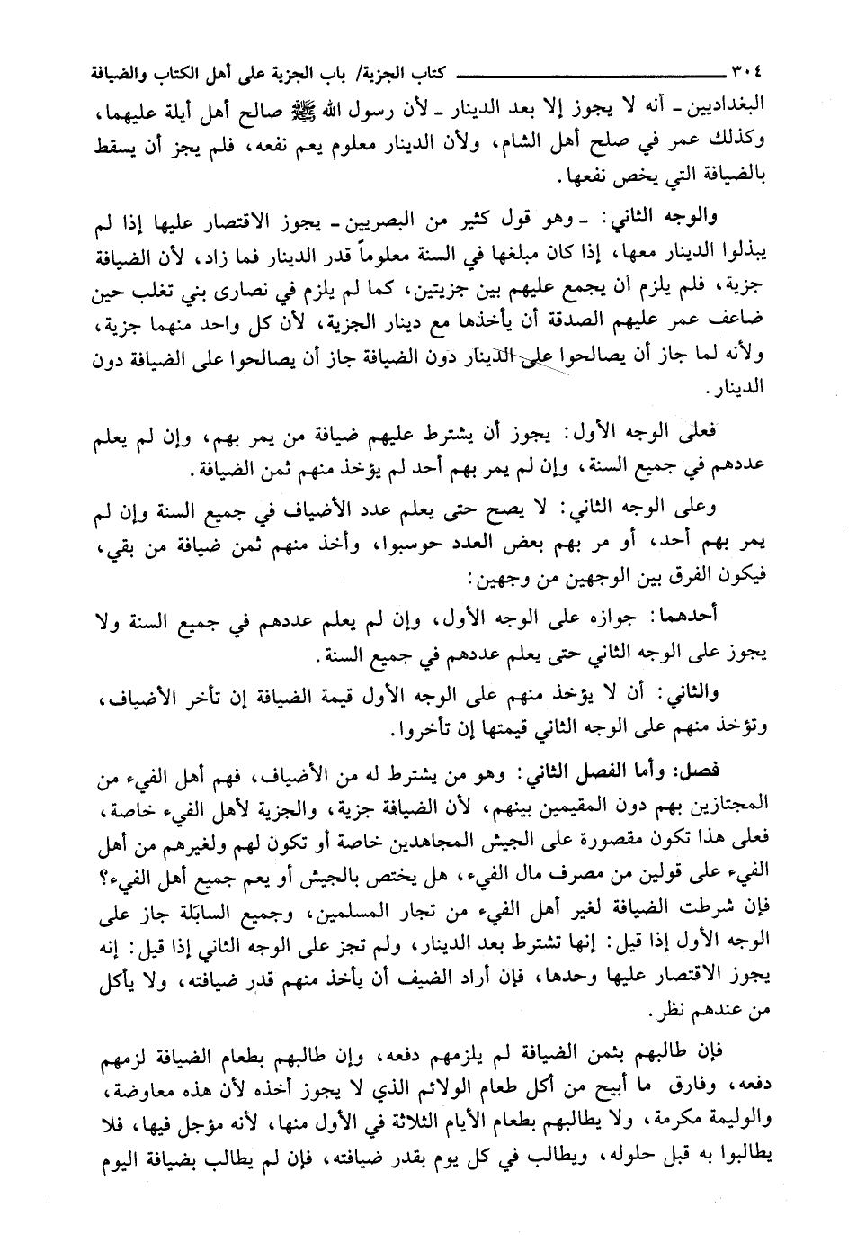 الْبَغْدَادِيِّينَ - أَنَّهُ لَا يَجُوزُ إِلَّا بَعْدَ الدِّينَارِ - لِأَنَّ رَسُولَ اللَّهِ - صَلَّى اللَّهُ عَلَيْهِ وَسَلَّم َ - صَالَحَ أَهْلَ أَيْلَةَ عَلَيْهِمَا، وَكَذَلِكَ عُمَرُ فِي صُلْحِ أَهْلِ الشَّامِ، وَلِأَنَّ الدِّينَارَ مَعْلُومٌ يَعُمُّ نَفْعُهُ، فَلَمْ يَجُزْ أَنْ يَسْقُطَ بِالضَّيَافَةِ الَّتِي يَخُصُّ نَفْعُهَا. وَالْوَجْهُ الثَّانِي: وَهُوَ قَوْلُ كَثِيرٍ مِنَ الْبَصْرِيِّينَ - يَجُوزُ الِاقْتِصَارُ عَلَيْهَا إِذَا لَمْ يبدلوا الدِّينَارَ مَعَهَا، إِذَا كَانَ مَبْلَغُهَا فِي السُّنَّةِ مَعْلُومًا قَدْرُ الدِّينَارِ فَمَا زَادَ، لِأَنَّ الضِّيَافَةَ جِزْيَةٌ، فَلَمْ يَلْزَمْ أَنْ يَجْمَعَ عَلَيْهِمْ بَيْنَ جزيئين، كما يلزم في نصارى بني تغلب حين وَلِأَنَّهُ لَمَّا جَازَ أَنْ يُصَالَحُوا عَلَى الدِّينَارِ دُونَ الضِّيَافَةِ جَازَ أَنْ يُصَالَحُوا عَلَى الضِّيَافَةِ دُونَ الدِّينَارِ. فَعَلَى الْوَجْهِ الْأَوَّلِ: يَجُوزُ أَنْ يُشْتَرَطَ عَلَيْهِمْ ضِيَافَةُ مَنْ يَمُرُّ بِهِمْ، وَإِنْ لَمْ يُعْلَمْ عَدَدُهُمْ فِي جَمِيعِ السَّنَةِ، وَإِنْ لَمْ يَمُرَّ بِهِمْ أَحَدٌ لَمْ يُؤْخَذْ مِنْهُمْ ثَمَنُ الضِّيَافَةِ. وَعَلَى الْوَجْهِ الثَّانِي: لَا يَصِحُّ حَتَّى يُعْلَمَ عَدَدُ الْأَضْيَافِ فِي جَمِيعِ السَّنَةِ وَإِنْ لَمْ يَمُرَّ بِهِمْ أَحَدٌ، أَوْ مَرَّ بِهِمْ بَعْضُ الْعَدَدِ حُوسِبُوا، وَأُخِذَ مِنْهُمْ ثَمَنُ ضِيَافَةِ مَنْ بَقِيَ، فَيَكُونُ الْفَرْقُ بَيْنَ الْوَجْهَيْنِ مِنْ وَجْهَيْنِ: أَحَدُهُمَا: جَوَازُهُ عَلَى الْوَجْهِ الْأَوَّلِ، وَإِنْ لَمْ يُعْلَمْ عَدَدُهُمْ فِي جَمِيعِ السَّنَةِ وَلَا يَجُوزُ عَلَى الْوَجْهِ الثَّانِي حَتَّى يُعْلَمَ عَدَدُهُمْ فِي جَمِيعِ السَّنَةِ. وَالثَّانِي: أَنْ لَا يُؤْخَذَ مِنْهُمْ عَلَى الْوَجْهِ الْأَوَّلِ قِيمَةُ الضِّيَافَةِ إِنْ تَأَخَّرَ الْأَضْيَافُ، وَتُؤْخَذَ مِنْهُمْ عَلَى الْوَجْهِ الثَّانِي قِيمَتُهَا إِنْ تَأَخَّرُوا.
