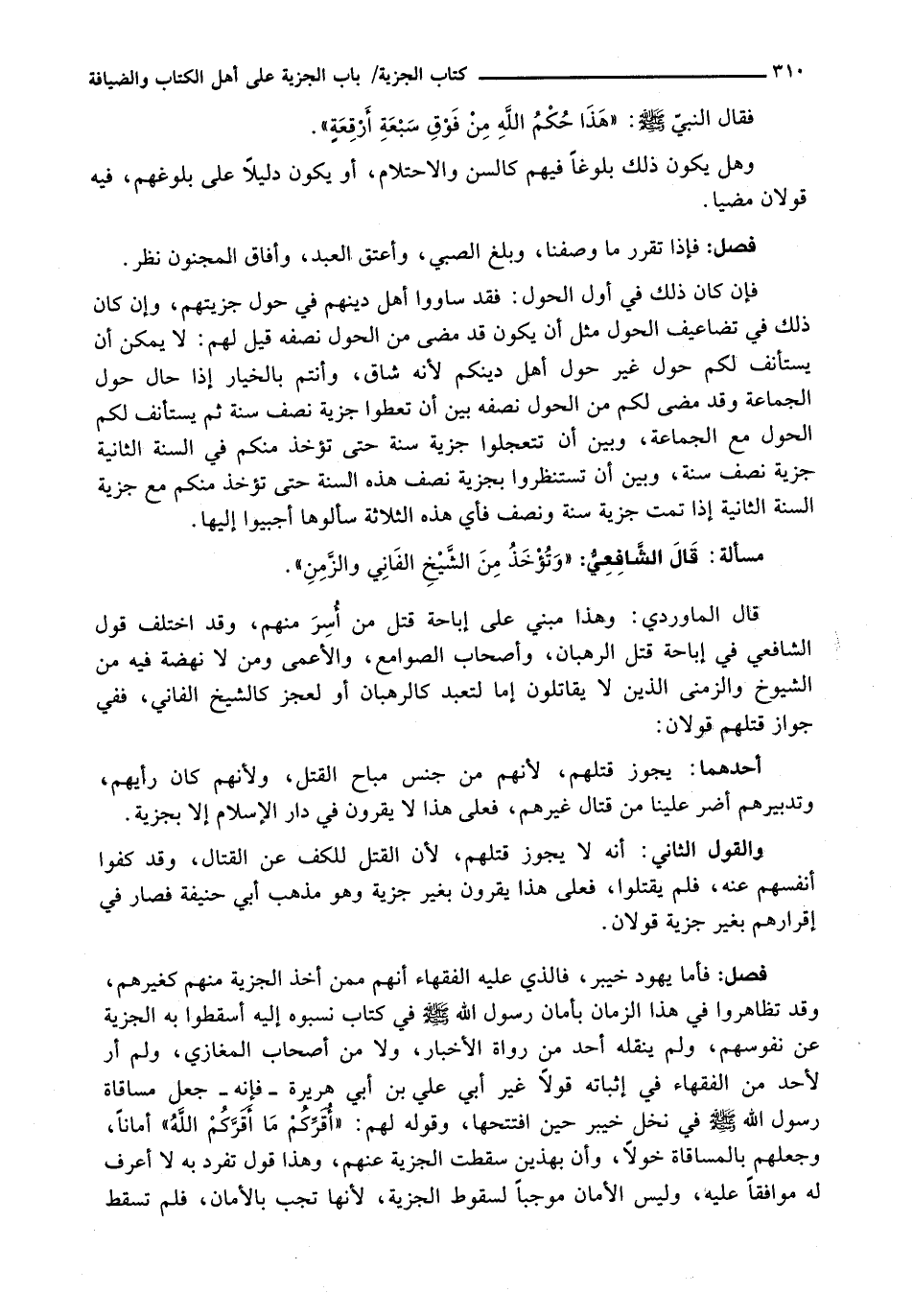 : فَأَمَّا يَهُودُ خَيْبَرَ، فَالَّذِي عَلَيْهِ الْفُقَهَاءُ أَنَّهُمْ مِمَّنْ أُخِذَ الْجِزْيَةُ مِنْهُمْ كَغَيْرِهِمْ، وَقَدْ تَظَاهَرُوا فِي هَذَا الزَّمَانِ بِأَمَانِ رَسُولِ اللَّهِ - صَلَّى اللَّهُ عَلَيْهِ وَسَلَّم َ - فِي كِتَابٍ نَسَبُوهُ إِلَيْهِ أَسْقَطُوا بِهِ الْجِزْيَةَ عَنْ نُفُوسِهِمْ، وَلَمْ يَنْقُلْهُ أَحَدٌ مِنْ رُوَاةِ الْأَخْبَارِ، وَلَا مِنْ أَصْحَابِ الْمَغَازِي، وَلَمْ أَرَ لِأَحَدٍ مِنَ الْفُقَهَاءِ فِي إِثْبَاتِهِ قَوْلًا غَيْرَ أَبِي عَلِيِّ بْنِ أَبِي هُرَيْرَةَ - فَإِنَّهُ - جَعَلَ مُسَاقَاةَ رَسُولِ اللَّهِ - صَلَّى اللَّهُ عَلَيْهِ وَسَلَّم َ - فِي نَخْلِ خَيْبَرَ حِينَ افْتَتَحَهَا، وَقَوْلُهُ لَهُمْ: " أُقِرُّكُمْ مَا أَقَرَّكُمُ اللَّهُ " أَمَانًا، وَجَعْلَهُمْ بِالْمُسَاقَاةِ خَوَلًا، وَأَنَّ بِهَذَيْنِ سَقَطَتِ الْجِزْيَةُ عَنْهُمْ، وَهَذَا قَوْلٌ تَفَرَّدَ بِهِ لَا أَعْرِفُ لَهُ مُوَافِقًا عَلَيْهِ، وَلَيْسَ الْأَمَانُ مُوجِبًا لِسُقُوطِ الْجِزْيَةِ، لِأَنَّهَا تَجِبُ بِالْأَمَانِ، فَلَمْ تَسْقُطْ