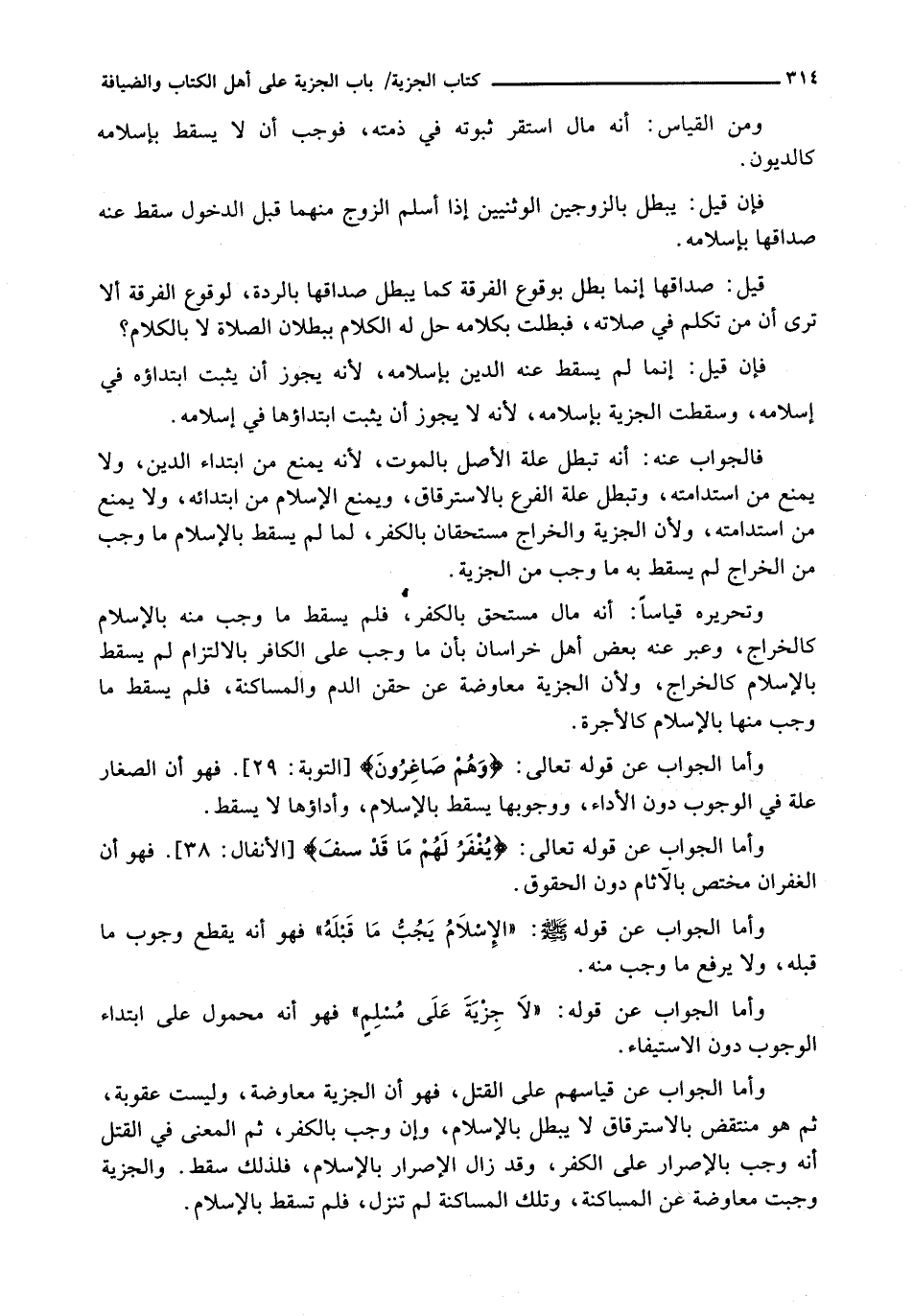 وَأَمَّا الْجَوَابُ عَنْ قَوْله تَعَالَى {وَهُمْ صَاغِرُونَ} [التوبة 29] . فَهُوَ أَنَّ الصَّغَارَ عِلَّةٌ فِي الْوُجُوبِ دُونَ الْأَدَاءِ، وَوُجُوبُهَا يَسْقُطُ بِالْإِسْلَامِ، وَأَدَاؤُهَا لَا يَسْقُطُ.