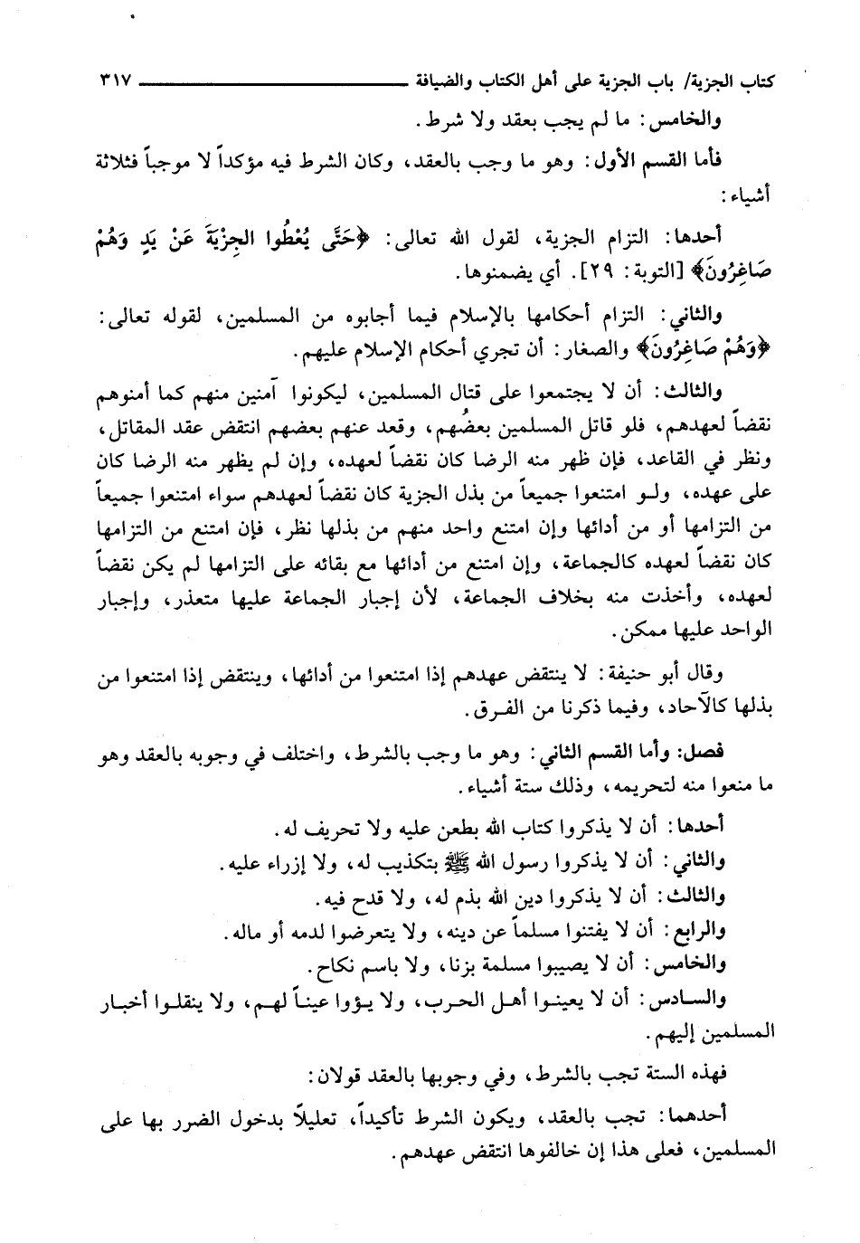 أَحَدُهَا: الْتِزَامُ الْجِزْيَةِ، لِقَوْلِ اللَّهِ تَعَالَى {حَتَّى يُعْطُوا الْجِزْيَةَ عَنْ يَدٍ وَهُمْ صَاغِرُونَ} [التوبة: 29] أي يضمنوها.