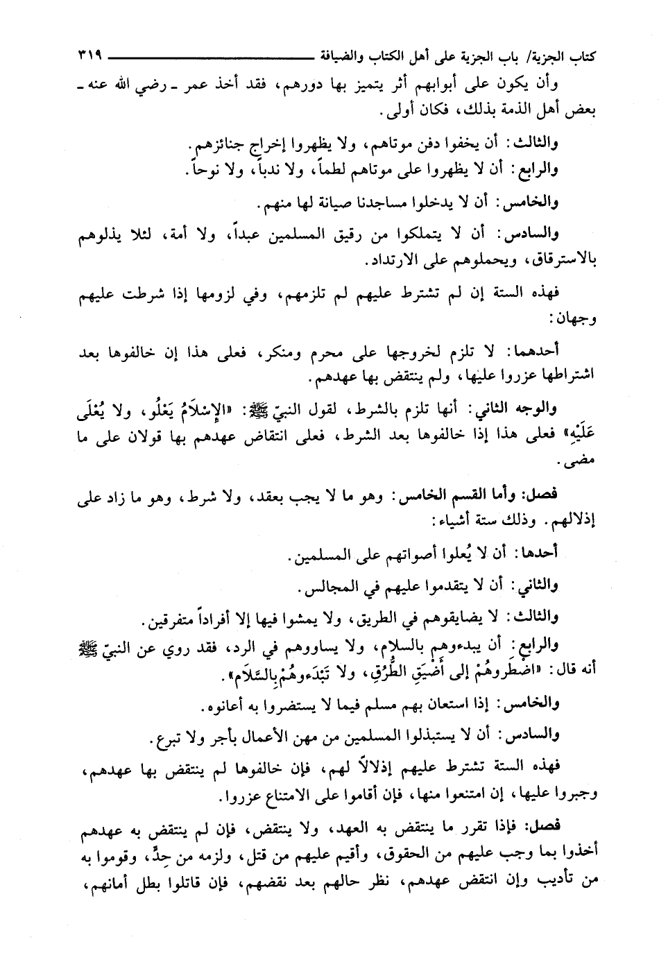 : وَأَمَّا الْقِسْمُ الْخَامِسُ: وَهُوَ مَا لَا يَجِبُ بِعَقْدٍ، وَلَا شَرْطٍ، وَهُوَ مَا زَادَ عَلَى إِذْلَالِهِمْ، وَذَلِكَ سِتَّةُ أَشْيَاءٍ: أَحَدُهَا: أَنْ لَا يُعْلُوا أَصْوَاتهُمْ عَلَى الْمُسْلِمِينَ. وَالثَّانِي: أَنْ لَا يَتَقَدَّمُوا عَلَيْهِمْ فِي الْمَجَالِسِ. وَالثَّالِثُ: لَا يُضَايِقُوهُمْ فِي الطَّرِيقِ، وَلَا يَمْشُوا فِيهَا إِلَّا أَفْرَادًا مُتَفَرِّقِينَ. وَالرَّابِعُ: أَنْ يَبْدَءُوهُمْ بِالسَّلَامِ، وَلَا يُسَاوُوهُمْ فِي الرَّدِّ، فَقَدْ رُوِيَ عَنِ النَّبِيِّ - صَلَّى اللَّهُ عَلَيْهِ وَسَلَّم َ - أَنَّهُ قَالَ: " اضْطَرُّوهُمْ إِلَى أَضْيَقِ الطُرُقِ، وَلَا تَبْدَءُوهُمْ بِالسَّلَامِ " وَالْخَامِسُ: إِذَا اسْتَعَانَ بِهِمْ مُسْلِمٌ فيما لا يستضروا بِهِ أَعَانُوهُ. وَالسَّادِسُ: أَنْ لَا يَسْتَبْذِلُوا الْمُسْلِمِينَ مِنْ مِهَنِ الْأَعْمَالِ بِأَجْرٍ وَلَا تَبَرُّعٍ. فَهَذِهِ السِّتَّةُ تُشْتَرَطُ عَلَيْهِمْ إِذْلَالًا لَهُمْ، فَإِنْ خَالَفُوهَا لَمْ يَنْتَقِضْ بِهَا عَهْدُهُمْ، وَجبِرُوا عَلَيْهَا، إِنِ امْتَنَعُوا مِنْهَا، فَإِنْ أَقَامُوا عَلَى الِامْتِنَاعِ عُزِّرُوا.