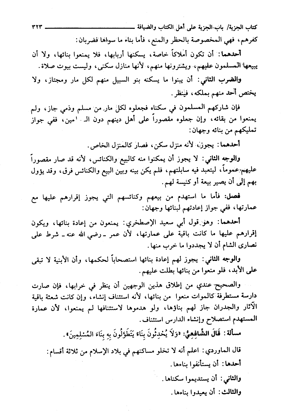 أَحَدُهُمَا: أَنْ تَكُونَ أَمْلَاكًا خاصة، يسكنها أربابها، فلا يمنعوا بنائها، وَلَا أَنْ يَبِيعَهَا الْمُسْلِمُونَ عَلَيْهِمْ، وَيَشْتَرُونَهَا مِنْهُمْ، لِأَنَّهَا مَنَازِلُ سُكْنَى، وَلَيْسَتْ بُيُوتَ صَلَاةٍ.