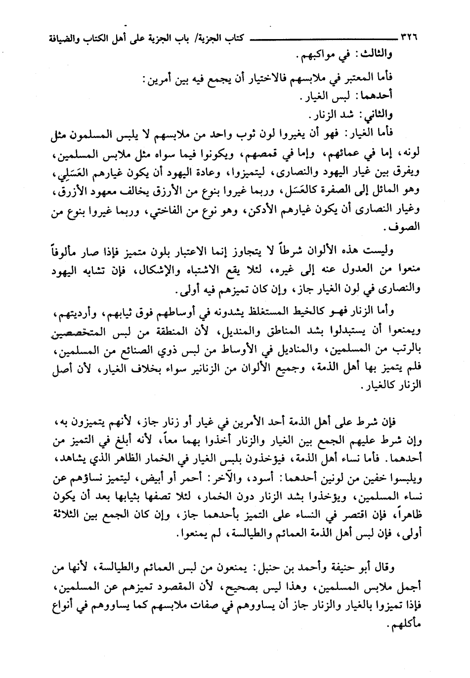 فَإِنْ شُرِطَ عَلَى أَهْلِ الذِّمَّةِ أَحَدُ الْأَمْرَيْنِ فِي غِيَارٍ أَوْ زُنَّارٍ جَازَ، لِأَنَّهُمْ يَتَمَيَّزُونَ بِهِ، وَإِنْ شَرَطَ عَلَيْهِمُ الْجَمْعَ بَيْنَ الْغِيَارِ وَالزُّنَّارِ أَخَذُوا بِهِمَا مَعًا، لِأَنَّهُ أَبْلَغُ فِي التَّمَيُّزِ مِنْ أَحَدِهِمَا. فَأَمَّا نساء أهل الذمة، فيؤخذون بِلُبْسِ الْغِيَارِ فِي الْخِمَارِ الظَّاهِرِ الَّذِي يُشَاهَدُ، ويلبسوا خُفَّيْنِ مِنْ لَوْنَيْنِ أَحَدُهُمَا: أَسْوَدُ، وَالْآخَرُ: أَحْمَرُ أَوْ أَبْيَضُ، لِيَتَمَيَّزَ نِسَاؤُهُمْ عَنْ نِسَاءِ الْمُسْلِمِينَ، ويؤخذوا بِشَدِّ الزُّنَّارِ دُونَ الْخِمَارِ، لِئَلَّا تَصِفَهَا بِثِيَابِهَا بَعْدَ أَنْ يَكُونَ ظَاهِرًا، فَإِنِ اقْتَصَرَ فِي النِّسَاءِ عَلَى التَّمَيُّزِ بِأَحَدِهِمَا جَازَ، وَإِنْ كَانَ الْجَمْعُ بَيْنَ الثَّلَاثَةِ أَوْلَى، فَإِنْ لَبِسَ أَهْلُ الذِّمَّةِ الْعَمَائِمَ وَالطَّيَالِسَةَ، لَمْ يُمْنَعُوا.