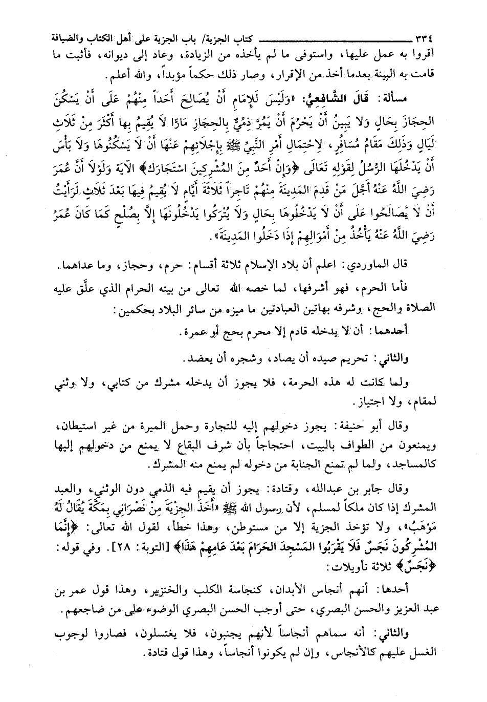 : قال الشافعي: " وَلَيْسَ لِلْإِمَامُ أَنْ يُصَالِحَ أَحَدًا مِنْهُمْ عَلَى أَنْ يَسْكُنَ الْحِجَازَ بِحَالٍ وَلَا يَبِينُ أَنْ يَحْرُمَ أَنْ يَمُرَّ ذِمِّيٌّ بِالْحِجَازِ مَارًّا لَا يُقِيمُ بِهَا أَكْثَرَ مِنْ ثَلَاثِ لَيَالٍ، وَذَلِكَ مقام مسافر، لاحتمال أمر النبي - صَلَّى اللَّهُ عَلَيْهِ وَسَلَّم َ - بإجلائهم عنها أن لا يسكنوها ولا بأس أن يدخلها الرسل لقوله تعالى: {وإن أحد من المشركين أستجارك} الآية ولولا أن عمر رضي الله عنه أجل من قدم المدينة منهم تاجرا ثلاثة أيام لا يقيم فيها بعد ثلاث لرأيت أن لا يصالحوا على أن لا يدخلوها بحال ولا يتركوا يدخلونها إلا بصلح كما كان عمر رضي الله عنه يأخذ من أموالهم إذا دخلوا المدينة ".