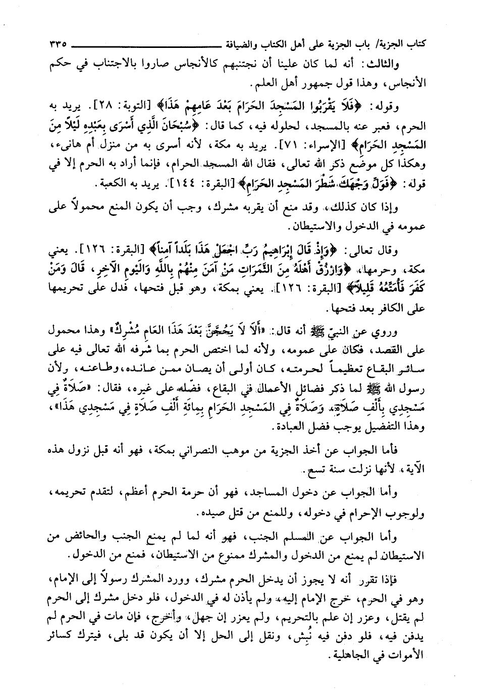 . وَهَذَا التَّفْضِيلُ يُوجِبُ فَضْلَ الْعِبَادَةِ. فَأَمَّا الْجَوَابُ عَنْ أَخْذِ الْجِزْيَةِ مِنْ مَوْهَبٍ النَّصْرَانِيِّ بِمَكَّةَ، فَهُوَ أَنَّهُ قَبْلَ نُزُولِ هَذِهِ الْآيَةِ، لِأَنَّها نَزَلَتْ سَنَةَ تِسْعٍ. وَأَمَّا الْجَوَابُ عَنْ دُخُولِ الْمَسَاجِدِ، فَهُوَ أَنَّ حُرْمَةَ الْحَرَمِ أَعْظَمُ، لِتَقَدُّمِ تَحْرِيمِهِ، وَلِوُجُوبِ الْإِحْرَامِ فِي دُخُولِهِ، وَلِلْمَنْعِ مِنْ قَتْلِ صَيْدِهِ. وَأَمَّا الْجَوَابُ عَنِ الْمُسْلِمِ الْجُنُبِ، فَهُوَ أَنَّهُ لَمَّا لَمْ يُمْنَعِ الْجُنُبُ وَالْحَائِضُ مِنْ الِاسْتِيطَانِ لَمْ يُمْنَعْ مِنَ الدُّخُولِ وَالْمُشْرِكُ مَمْنُوعٌ مِنْ الِاسْتِيطَانِ، فَمُنِعَ مِنَ الدُّخُولِ. فَإِذَا تَقَرَّرَ أَنَّهُ لَا يَجُوزُ أَنْ يَدْخُلَ الْحَرَمَ مُشْرِكٌ، وَوَرَدَ الْمُشْرِكُ رَسُولًا إِلَى الْإِمَامِ، وَهُوَ فِي الْحَرَمِ، خَرَجَ الْإِمَامُ إِلَيْهِ، وَلَمْ يَأْذَنْ لَهُ فِي الدُّخُولِ، فَلَوْ دَخَلَ مُشْرِكٌ إِلَى الْحَرَمِ لَمْ يُقْتَلْ، وَعُزِّرَ إِنْ عَلِمَ بِالتَّحْرِيمِ، وَلَمْ يُعَزَّرْ إِنْ جَهِلَ، وَأُخْرِجَ، فَإِنْ مَاتَ فِي الْحَرَمِ لَمْ يُدْفَنْ فِيهِ، فَلَوْ دُفِنَ فِيهِ نُبِشَ، وَنُقِلَ إِلَى الْحِلِّ إِلَّا أَنْ يَكُونَ قَدْ بَلِيَ، فَيُتْرَكَ كَسَائِرِ الْأَمْوَاتِ فِي الْجَاهِلِيَّةِ.