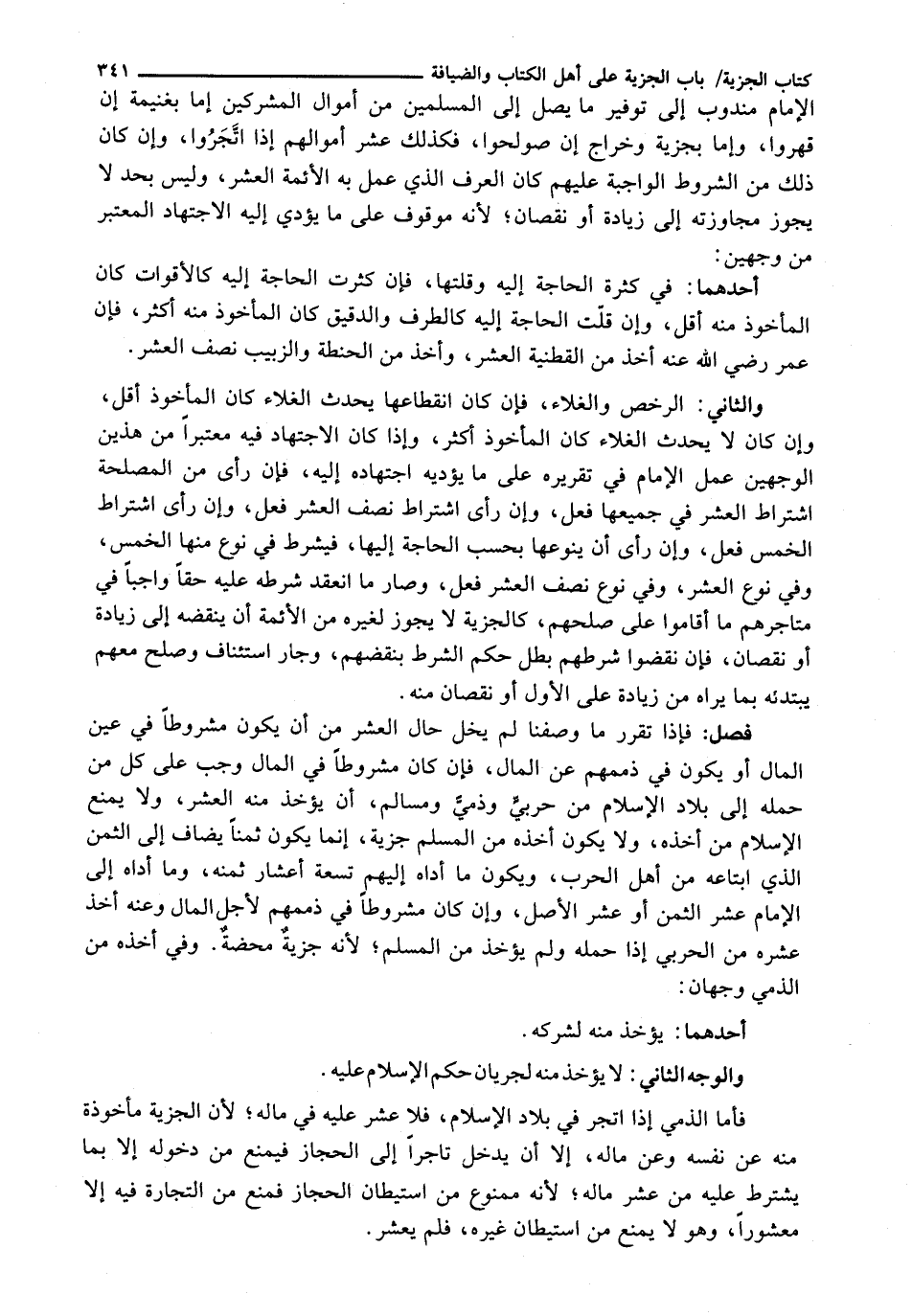 الْإِمَامَ مَنْدُوبٌ إِلَى تَوْفِيرِ مَا يَصِلُ إِلَى الْمُسْلِمِينَ مِنْ أَمْوَالِ الْمُشْرِكِينَ إِمَّا بِغَنِيمَةٍ إِنْ قُهِرُوا، وَإِمَّا بِجِزْيَةٍ وَخَرَاجٍ إِنْ صُولِحُوا، فَكَذَلِكَ عُشْرُ أَمْوَالِهِمْ إِذَا اتَّجَرُوا، وَإِنْ كَانَ ذَلِكَ مِنَ الشُّرُوطِ الْوَاجِبَةِ عَلَيْهِمْ كَانَ الْعُرْفُ الَّذِي عَمِلَ بِهِ الْأَئِمَّةُ الْعُشْرَ، وَلَيْسَ بِحَدٍّ لَا يَجُوزُ مُجَاوَزَتُهُ إِلَى زِيَادَةٍ أَوْ نُقْصَانٍ، لِأَنَّهُ مَوْقُوفٌ عَلَى مَا يُؤَدِّي إِلَيْهِ الِاجْتِهَادُ الْمُعْتَبَرُ مِنْ وَجْهَيْنِ: