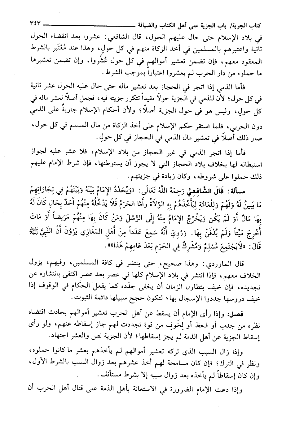 : قال الشافعي رحمه الله تعالى: " وَيُحَدِّدُ الْإِمَامُ بَيْنَهُ وَبَيْنَهُمْ فِي تِجَارَاتِهِمْ مَا يَبِينُ لَهُ وَلَهُمْ وَلِلْعَامَّةِ لِيَأْخُذَهُمْ بِهِ الْوُلَاةُ وَأَمَّا الْحَرَمُ فَلَا يَدْخُلَهُ مِنْهُمْ أَحَدٌ بِحَالٍ كان له بها مال أو لم يكن ويخرج الإمام منه إلى الرسل ومن كان بها منهم مريضا أو مات أخرج ميتا ولم يدفن بها، وروي أنه سمع عددا من أهل المغازي يرون أن النبي - صَلَّى اللَّهُ عَلَيْهِ وَسَلَّم َ - قال: "