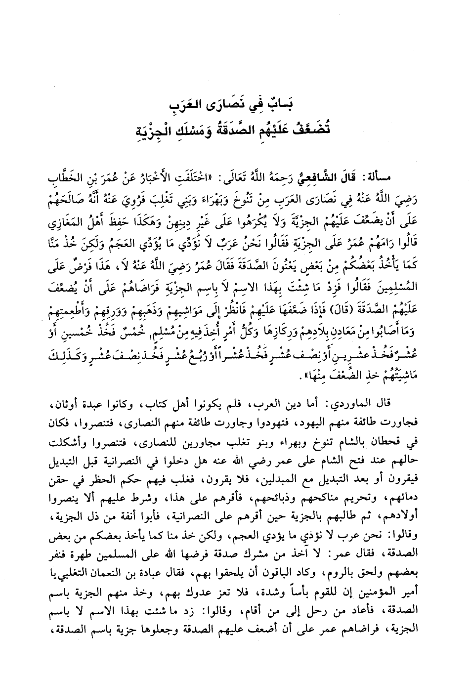 : قال الشافعي رحمه الله تعالى: " اخْتَلَفَتِ الْأَخْبَارُ عَنْ عُمَرَ بْنِ الْخَطَّابِ رَضِيَ اللَّهُ عَنْهُ فِي نَصَارَى الْعَرَبِ مِنْ تَنُوخَ وَبَهْرَاءَ وَبَنِي تَغْلِبَ فَرُوِيَ عَنْهُ أَنَّهُ صَالَحَهُمْ عَلَى أَنْ يُضَعِّفَ عَلَيْهُمُ الْجِزْيَةَ وَلَا يُكْرَهُوا على غير دينهم وهكذا حفظ أهل المغازي قالوا رامهم عمر على الجزية فقالوا نَحْنُ عَرَبٌ لَا نُؤَدِّي مَا يُؤَدِّي الْعَجَمُ، وَلَكِنْ خُذْ مِنَّا كَمَا يَأْخُذُ بَعْضُكُمْ مِنْ بعض يعنون الصدقة فقال عمر رضي الله عنه لا، هذا فرض على المسلمين فقالوا فزد مَا شِئْتَ بِهَذَا الِاسْمِ لَا بِاسْمِ الْجِزْيَةِ فراضاهم على أن يضعف عليهم الصدقة (قال) فإذا ضعفها عليهم فانظر إلى مواشيهم وذهبهم وورقهم وأطعمتهم وما أصابوا من معادن بلادهم وركازها وكل أمر أخذ فيه من مسلم خمس فخذ خمسين أو عشر فخذ عشرين أو نصف عشر فخذ عشرا أو ربع عشر فخذ نصف عشر وكذلك ماشيتهم خذ الضعف منها ".