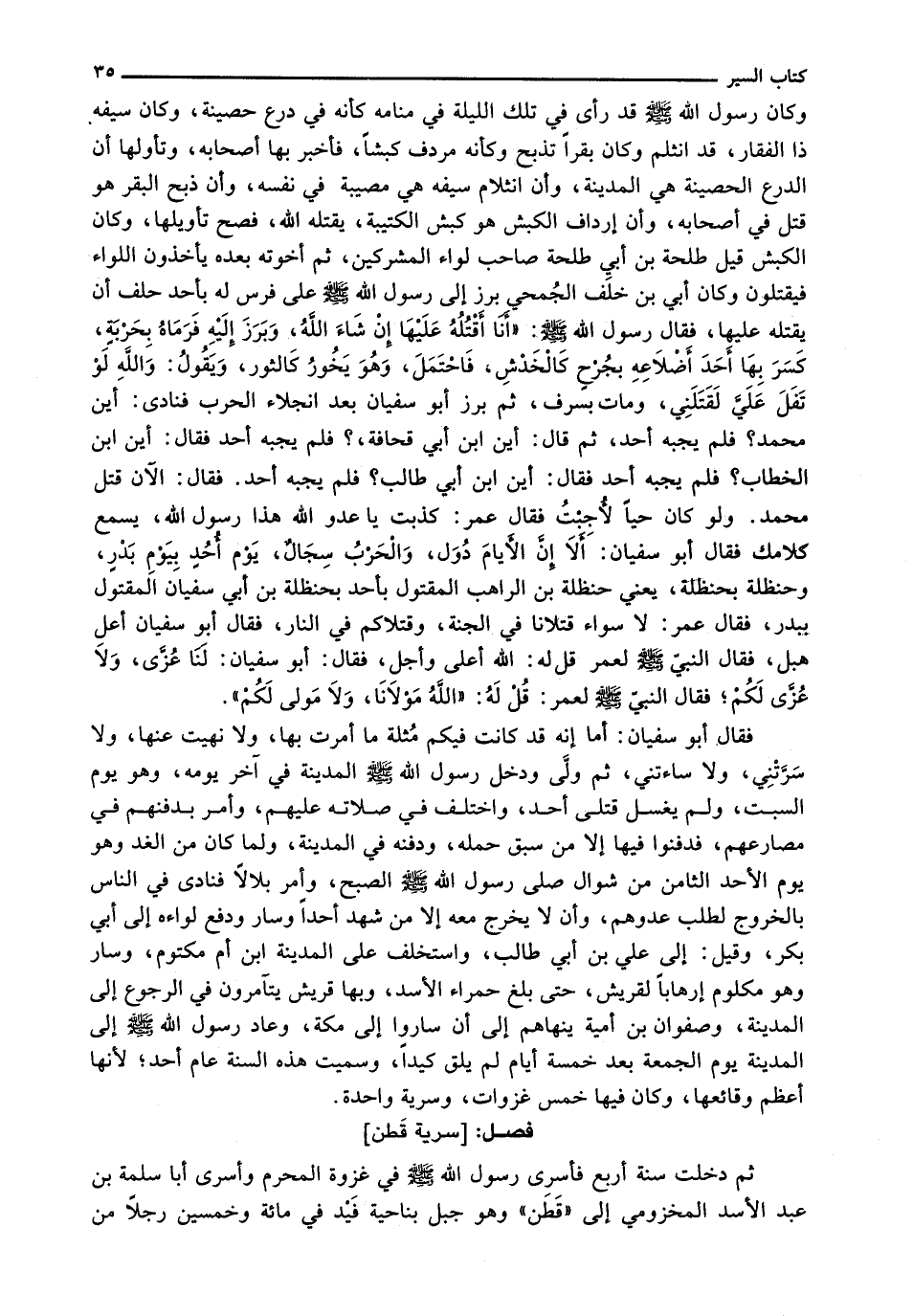 فَقَالَ أَبُو سُفْيَانَ: أَمَا إِنَّهُ قَدْ كَانَتْ فِيكُمْ مُثْلَةٌ مَا أَمَرْتُ بِهَا، وَلَا نَهَيْتُ عَنْهَا، وَلَا سَرَّتْنِي، وَلَا سَاءَتْنِي، ثُمَّ وَلَّى وَدَخَلَ رَسُولُ اللَّهِ - صَلَّى اللَّهُ عَلَيْهِ وَسَلَّم َ - الْمَدِينَةَ فِي آخِرِ يَوْمِهِ، وَهُوَ يَوْمُ السَّبْتِ، وَلَمْ يُغَسِّلْ قَتْلَى أُحُدٍ، وَاخْتُلِفَ فِي صَلَاتِهِ عَلَيْهِمْ، وَأَمَرَ بِدَفْنِهِمْ فِي مَصَارِعِهِمْ، فَدُفِنُوا فِيهَا إِلَّا مَنْ سَبَقَ حَمْلُهُ، وَدَفْنُهُ فِي الْمَدِينَةِ، وَلَمَّا كَانَ مِنَ الْغَدِ وَهُوَ يَوْمُ الْأَحَدِ الثَّامِنِ مِنْ شَوَّالٍ صَلَّى رَسُولُ اللَّهِ - صَلَّى اللَّهُ عَلَيْهِ وَسَلَّم َ - الصُّبْحَ، وَأَمَرَ بِلَالًا فَنَادَى فِي النَّاسِ بِالْخُرُوجِ لِطَلَبِ عَدُوِّهِمْ، وَأَنْ لَا يَخْرُجَ مَعَهُ إِلَّا مَنْ شَهِدَ أُحُدًا وَسَارَ وَدَفَعَ لِوَاءَهُ إِلَى أَبِي بَكْرٍ، وَقِيلَ: إِلَى عَلِيِّ بْنِ أَبِي طَالِبٍ، وَاسْتَخَلَفَ عَلَى الْمَدِينَةِ ابْنَ أُمِّ مَكْتُومٍ، وَسَارَ وَهُوَ مَكْلُومٌ إِرْهَابًا لِقُرَيْشٍ، حَتَّى بَلَغَ حَمْرَاءَ الْأَسَدِ، وَبِهَا قُرَيْشٌ يَتَآمَرُونَ فِي الرُّجُوعِ إِلَى الْمَدِينَةِ، وَصَفْوَانُ بْنُ أُمَيَّةَ يَنْهَاهُمْ إِلَى أَنْ سَارُوا إِلَى مَكَّةَ، وَعَادَ رَسُولُ اللَّهِ - صَلَّى اللَّهُ عَلَيْهِ وَسَلَّم َ - إِلَى الْمَدِينَةِ يَوْمَ الجُمُعَةِ بَعْدَ خَمْسَةِ أَيَّامٍ لَمْ يَلْقَ كَيْدًا، وَسُمِّيَتْ هَذِهِ السَّنَةُ عَامَ أُحُدٍ؛ لِأَنَّهَا أَعْظَمُ وَقَائِعِهَا، وَكَانَ فِيهَا خَمْسُ غزوات، وسرية واحدة