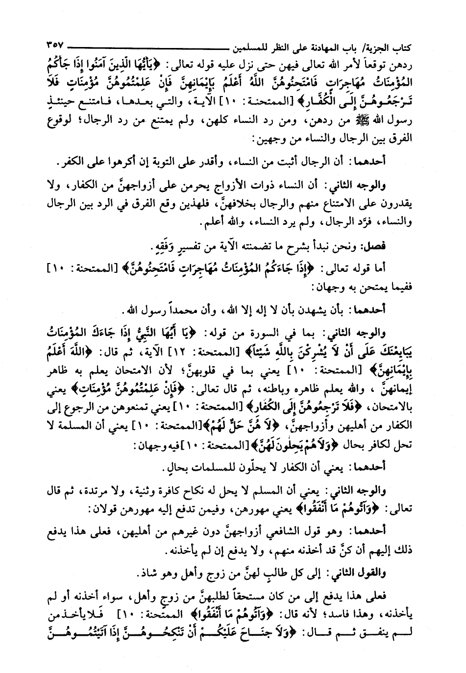 وَالْوَجْهُ الثَّانِي: بِمَا فِي السُّورَةِ مِنْ قَوْلِهِ: {يَا أَيُّهَا النَّبِيُّ إِذَا جَاءَكَ الْمُؤْمِنَاتُ يُبَايِعْنَكَ عَلَى أَنْ لا يُشْرِكْنَ بِاللَّهِ شَيْئًا} [الممتحنة: 12] الْآيَةَ.، ثُمَّ قَالَ: {اللَّهُ أَعْلَمُ بِإِيمَانِهِنَّ} [الممتحنة: 10] يَعْنِي بِمَا فِي قُلُوبِهِنَّ؛ لِأَنَّ الِامْتِحَانَ يُعْلَمُ بِهِ ظَاهِرُ إِيمَانِهِنَّ، وَاللَّهُ يَعْلَمُ ظَاهِرَهُ وَبَاطِنَهُ، ثُمَّ قال تعالى: {فإن علمتموهن مؤمنات} يَعْنِي بِالِامْتِحَانِ، {فَلا تَرْجِعُوهُنَّ إِلَى الْكُفَّارِ} [الممتحنة: 10] يَعْنِي تَمْنَعُوهُنَّ مِنَ الرُّجُوعِ إِلَى الْكُفَّارِ مِنْ أَهْلِيهِنَّ وَأَزْوَاجِهِنَّ {لا هُنَّ حِلٌّ لَهُمْ} [الممتحنة: 10] يَعْنِي أَنَّ الْمُسْلِمَةَ لَا تَحِلُّ لِكَافِرٍ بِحَالٍ {وَلا هُمْ يَحِلُّونَ لَهُنَّ} [الممتحنة: 10] فِيهِ وَجْهَانِ: