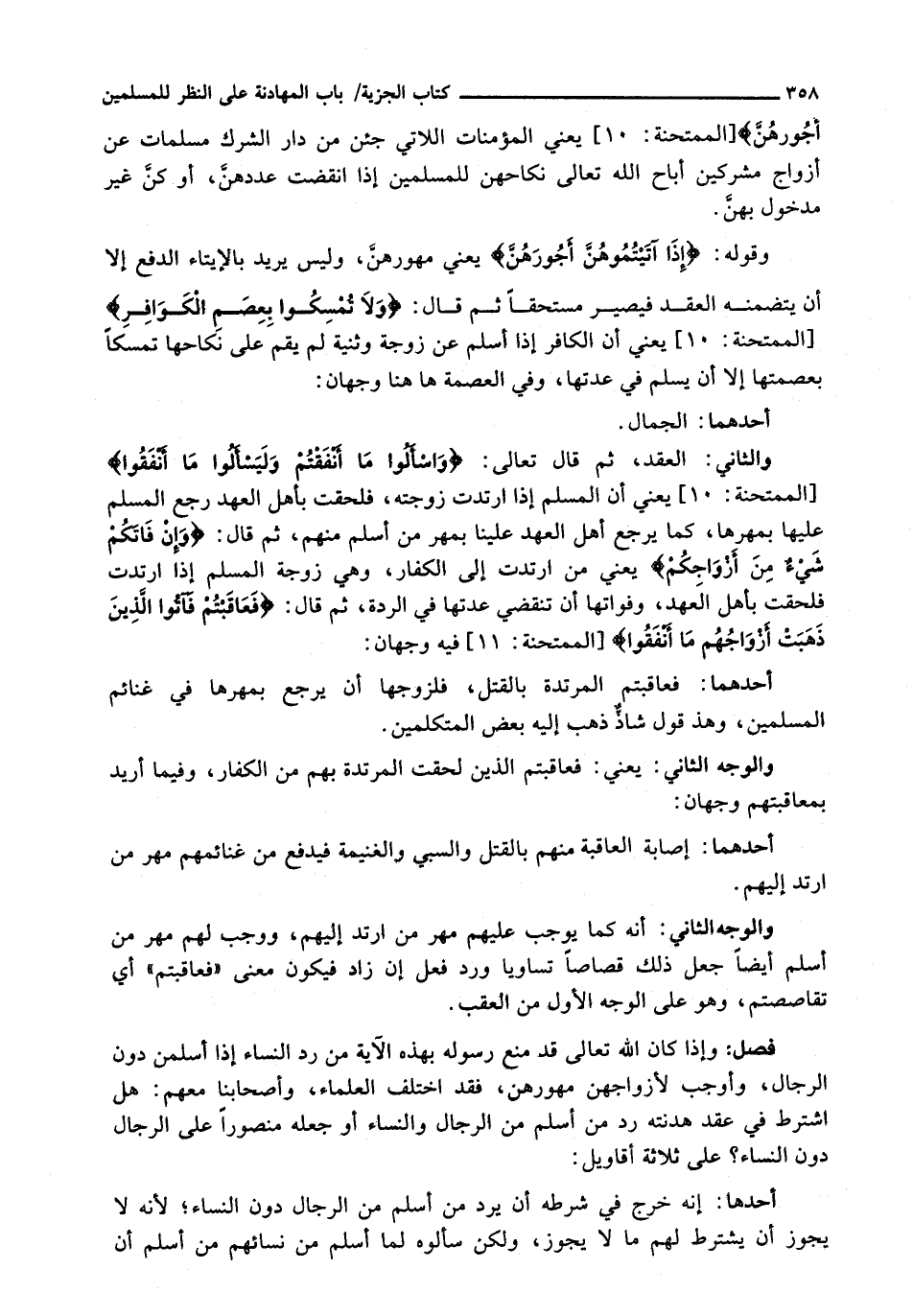 : وَإِذَا كَانَ اللَّهُ تَعَالَى قَدْ مَنَعَ رَسُولَهُ بِهَذِهِ الْآيَةِ مِنْ رَدِّ النِّسَاءِ إِذَا أَسْلَمْنَ دُونَ الرِّجَالِ، وَأَوْجَبَ لِأَزْوَاجِهِنَّ مُهُورَهُنَّ، فَقَدِ اخْتَلَفَ الْعُلَمَاءُ، وَأَصْحَابُنَا مَعَهُمْ: هَلِ اشْتَرَطَ فِي عَقْدِ هُدْنَتِهِ رَدَّ مَنْ أَسْلَمَ مِنَ الرجال والنساء أو جعله منصورا عَلَى الرِّجَالِ دُونَ النِّسَاءِ؟ عَلَى ثَلَاثَةِ أَقَاوِيلَ: