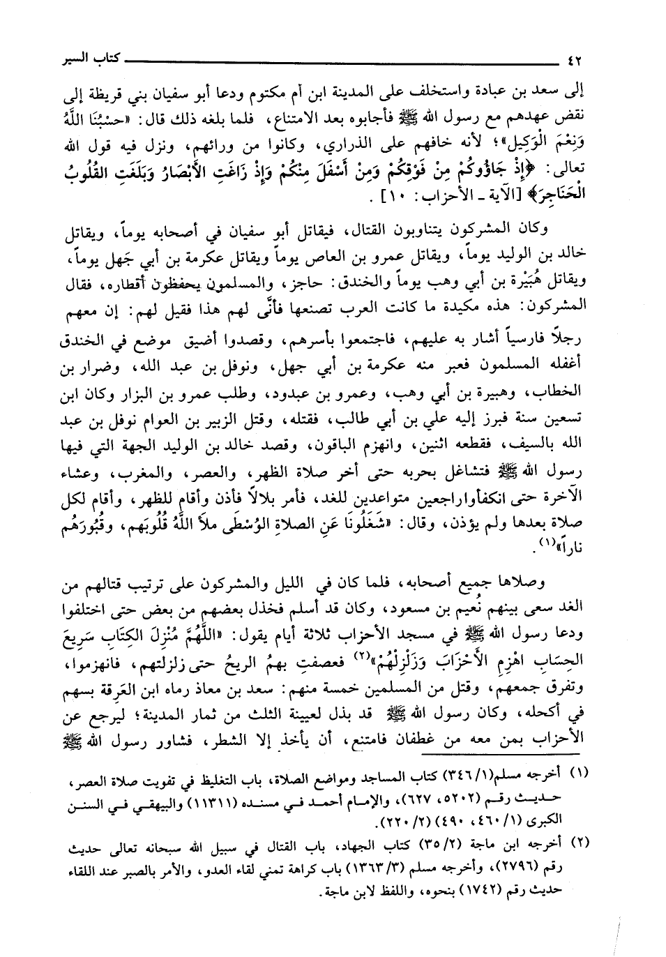 وَصَلَّاهَا جَمِيعُ أَصْحَابِهِ، فَلَمَّا كَانَ فِي اللَّيْلِ وَالْمُشْرِكُونَ عَلَى تَرْتِيبِ قِتَالِهِمْ مِنَ الْغَدِ سَعَى بَيْنَهُمْ نُعَيْمُ بْنُ مَسْعُودٍ، وَكَانَ قَدْ أَسْلَمَ فَخَذَّلَ بَعْضُهُمْ مِنْ بَعْضٍ حَتَّى اخْتَلَفُوا وَدَعَا رَسُولُ اللَّهِ - صَلَّى اللَّهُ عَلَيْهِ وَسَلَّم َ - فِي مَسْجِدِ الْأَحْزَابِ ثَلَاثَةَ أَيَّامٍ يَقُولُ: " اللَّهُمَّ مُنْزِلَ الْكِتَابِ سَرِيعَ الْحِسَابِ اهْزِمِ الْأَحْزَابَ وَزَلْزِلْهُمْ " فَعَصَفَتِ بِهِمُ الرِّيحُ حَتَّى زَلْزَلَتْهُمْ، فَانْهَزَمُوا وَتَفَرَّقَ جَمْعُهُمْ، وَقُتِلَ مِنَ الْمُسْلِمِينَ خَمْسَةٌ مِنْهُمْ: سَعْدُ بْنُ مُعَاذٍ رَمَاهُ ابْنُ الْعَرِقَةِ بِسَهْمٍ فِي أَكْحَلِهِ، وَكَانَ رَسُولُ اللَّهِ - صَلَّى اللَّهُ عَلَيْهِ وَسَلَّم َ - قَدْ بَذَلَ لِعُيَيْنَةَ الثُّلُثَ مِنْ ثِمَارِ الْمَدِينَةِ؛ لِيَرْجِعَ عَنِ الْأَحْزَابِ بِمَنْ مَعَهُ مِنْ غَطَفَانَ فَامْتَنَعَ، أَنْ يَأْخُذَ إِلَّا الشَّطْرَ، فَشَاوَرَ رَسُولُ الله - صَلَّى اللَّهُ عَلَيْهِ وَسَلَّم َ -